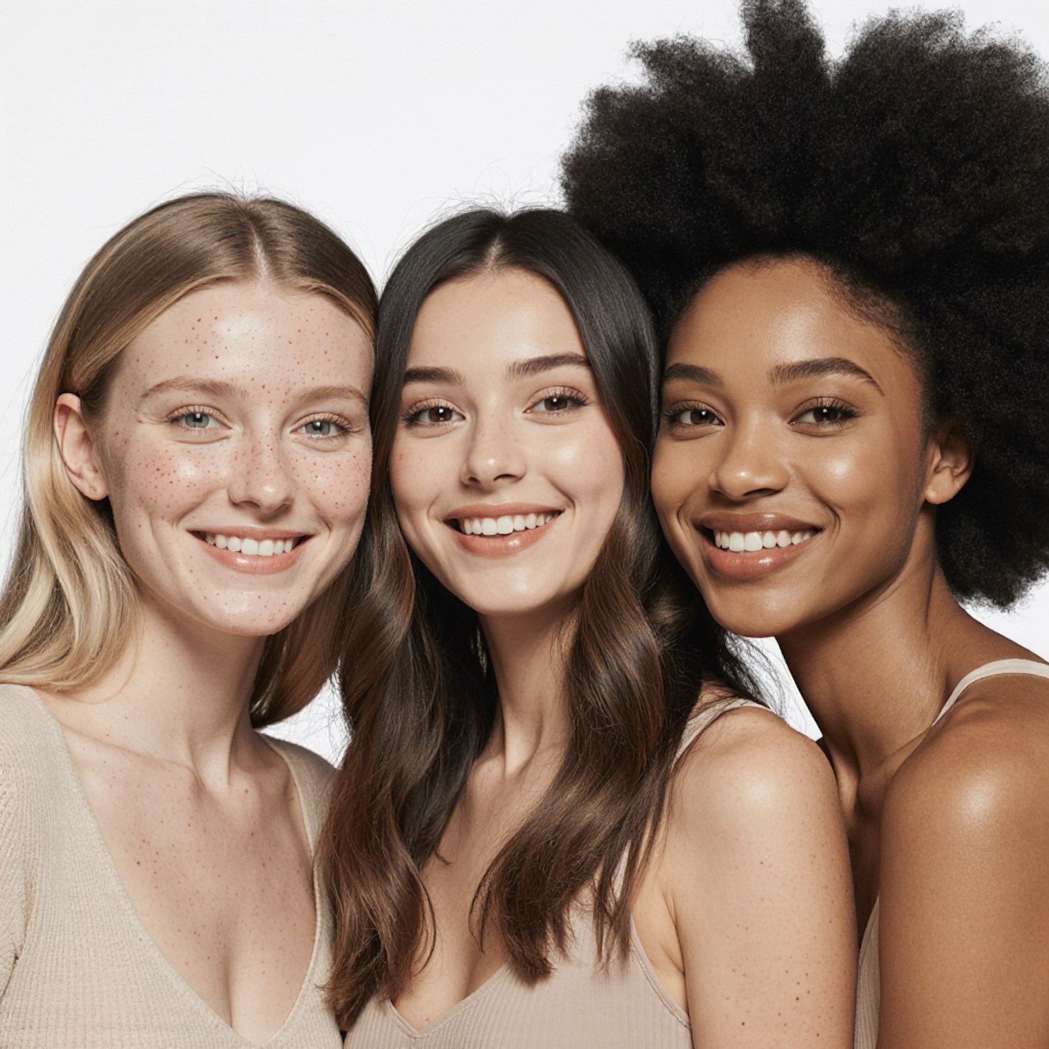 Three women of diverse backgrounds smiling together, showcasing natural beauty and unity in a bright, minimalistic setting.