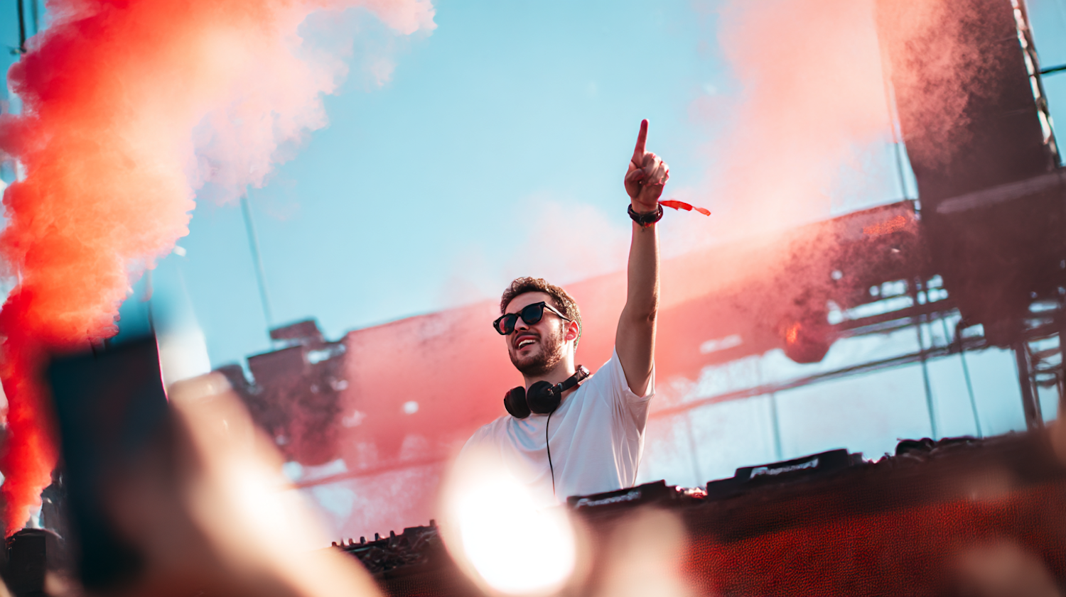A DJ performs on an outdoor stage with red smoke effects and a vibrant crowd, creating an energetic festival atmosphere.