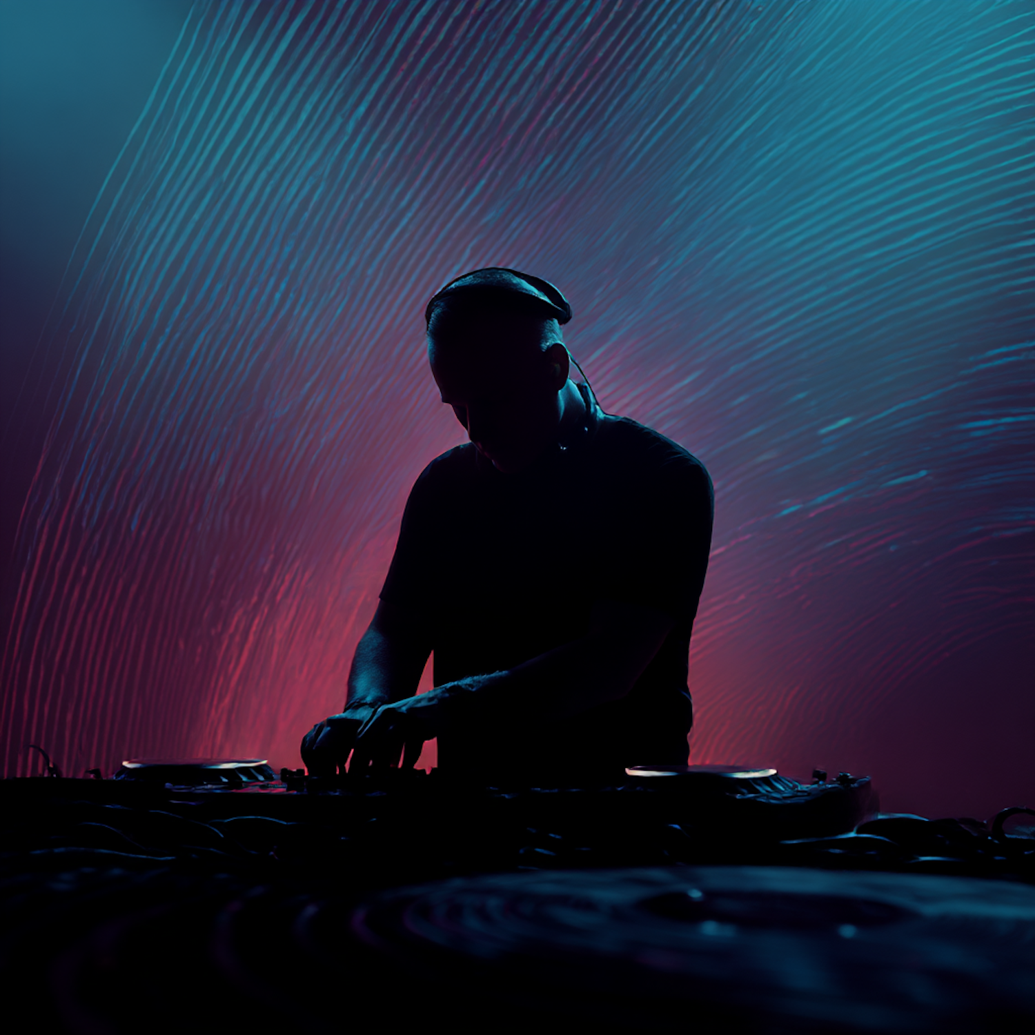 A DJ silhouette against vibrant blue and red lights, mixing music in a dynamic and energetic setting with abstract light patterns.