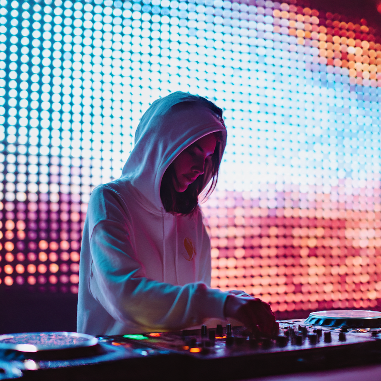 A DJ in a white hoodie operates a mixer against a vibrant LED backdrop, creating an energetic and colorful atmosphere.