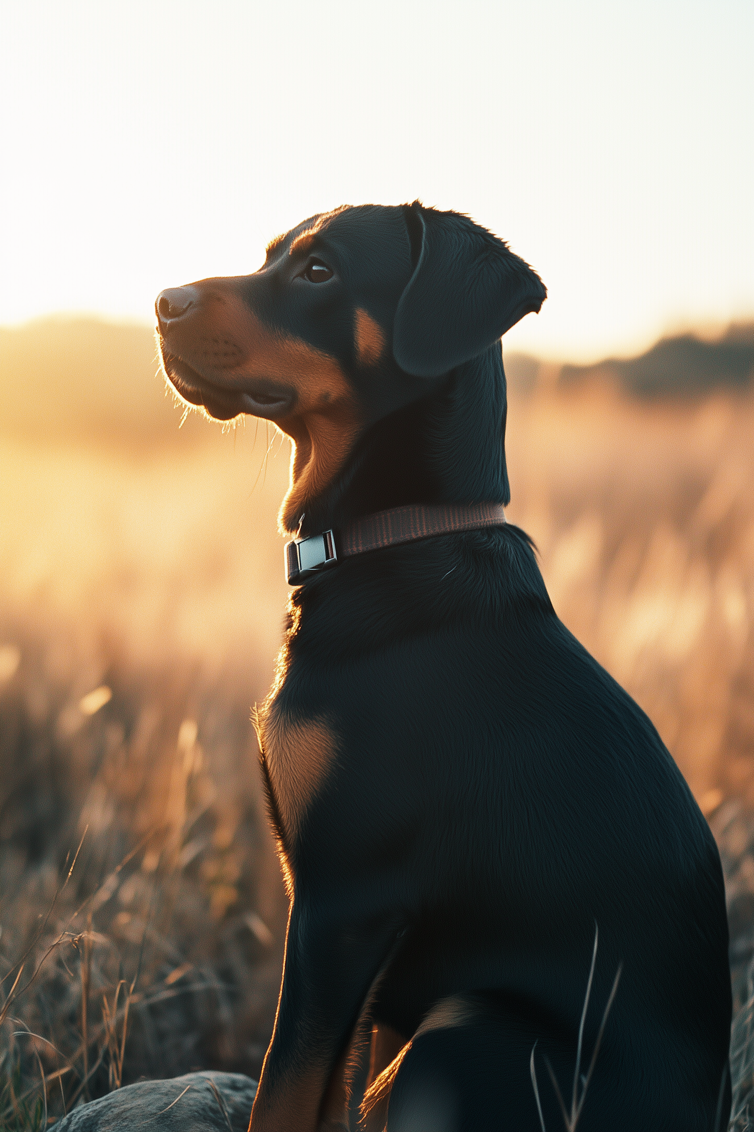 A Doberman pinscher sits in a sunlit field, its sleek black coat glowing in the golden light, exuding elegance and alertness.