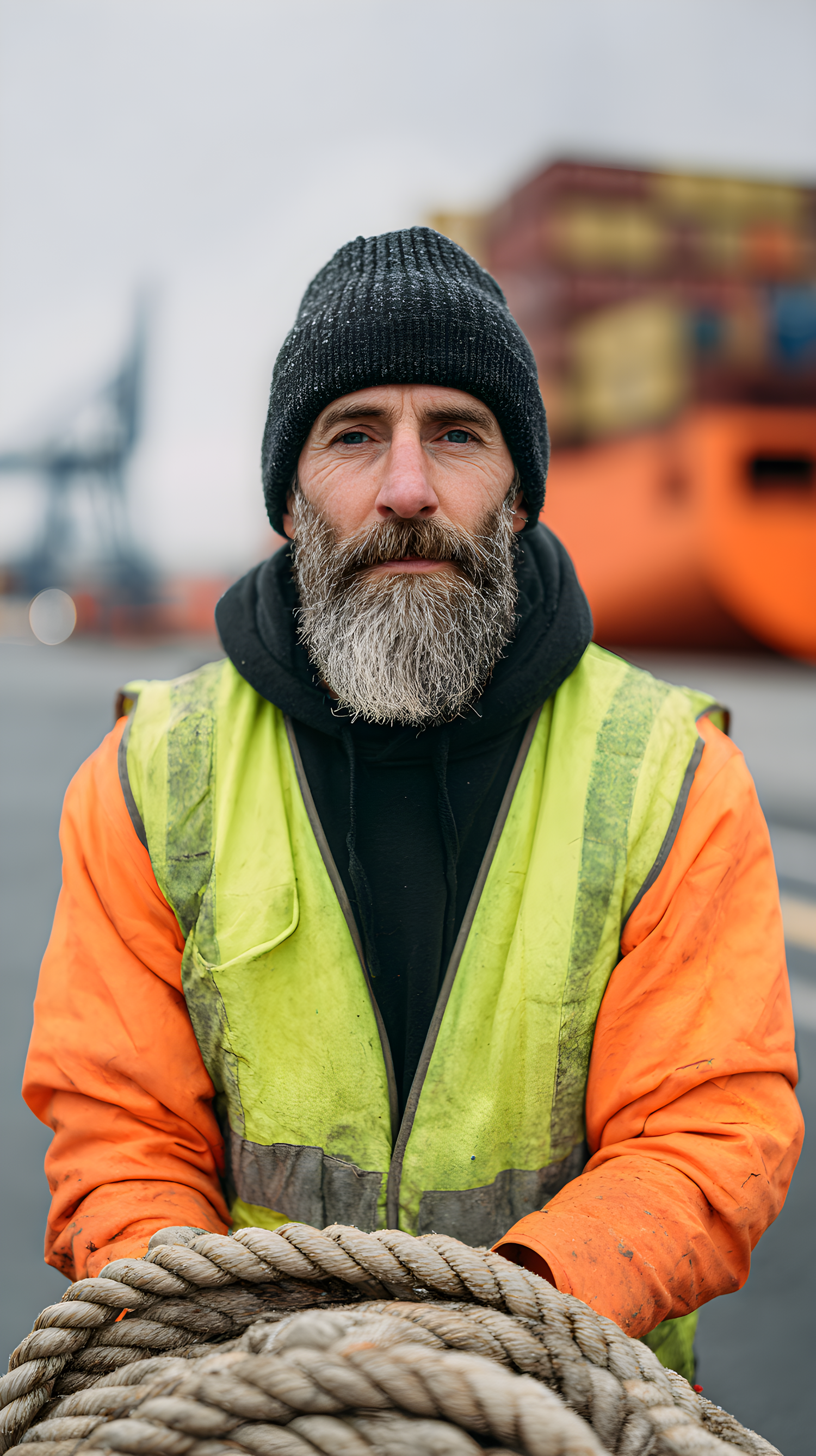 A dockworker in a high-visibility vest and knit cap holds a coiled rope, with shipping containers and cranes in the background.