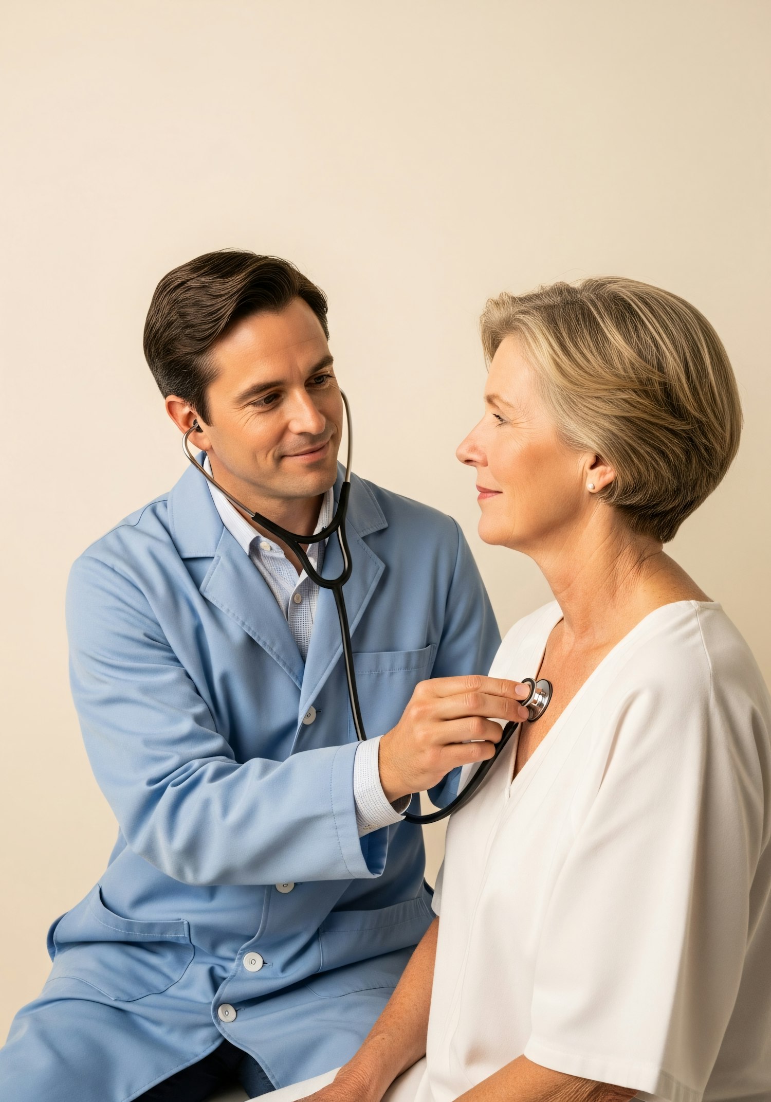 A doctor in a blue coat listens to a patient's heartbeat with a stethoscope in a calm, professional setting.