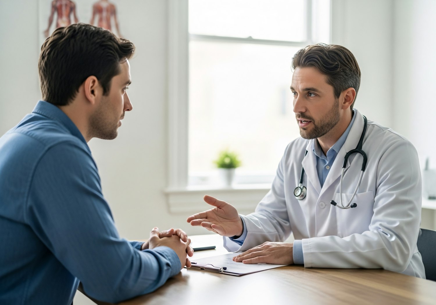 A doctor and patient discussing health in a bright, professional office setting, emphasizing communication and care.
