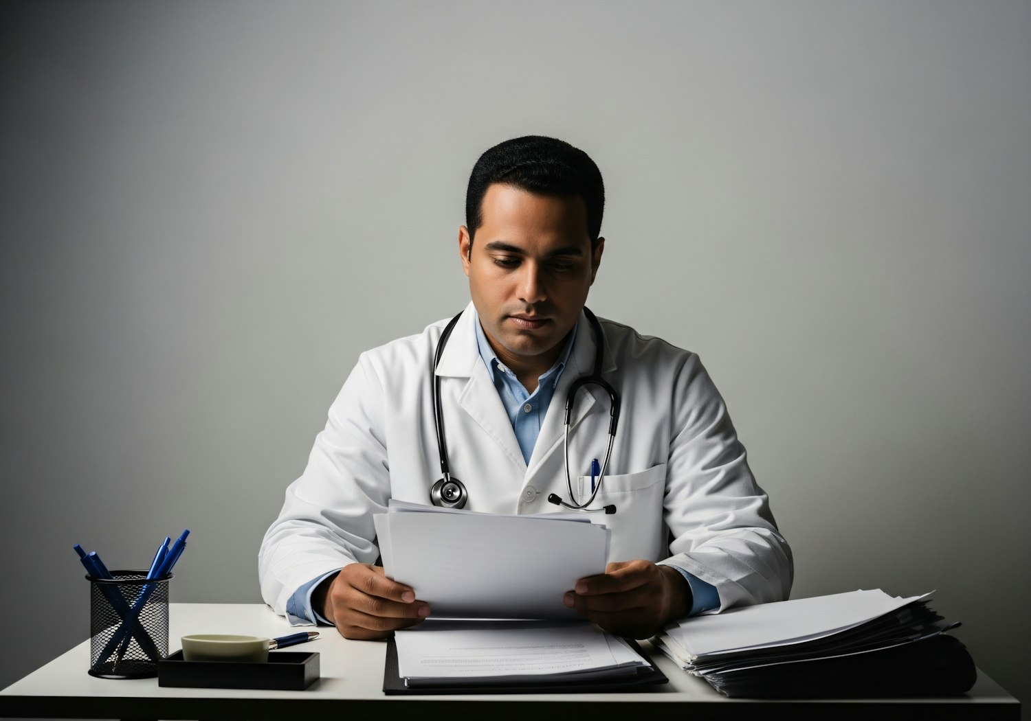 A doctor in a white coat reviews documents at a desk, with a stethoscope around his neck, in a professional and focused setting.