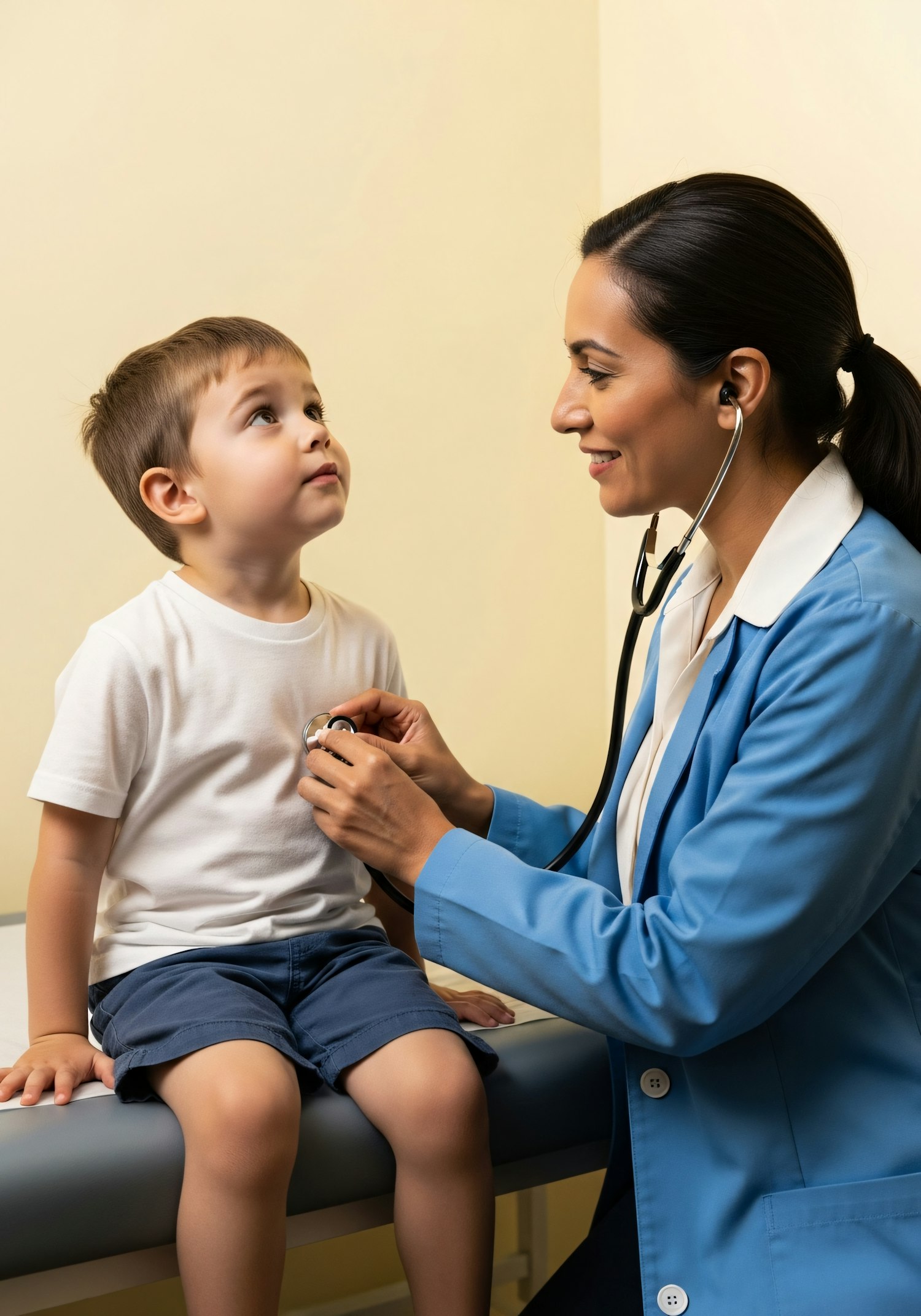 A doctor in a blue coat examines a young boy with a stethoscope in a medical office, showcasing a caring and professional interaction.