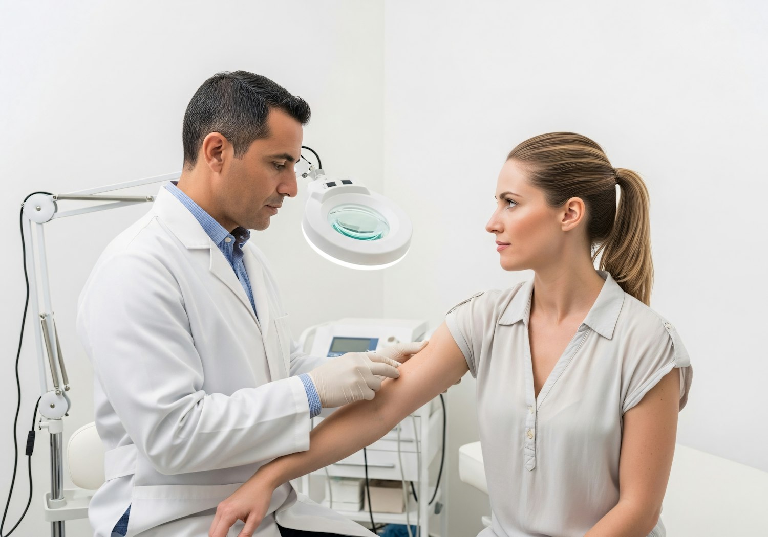 A doctor examines a patient's arm in a bright, clean medical office, showcasing a professional healthcare interaction.