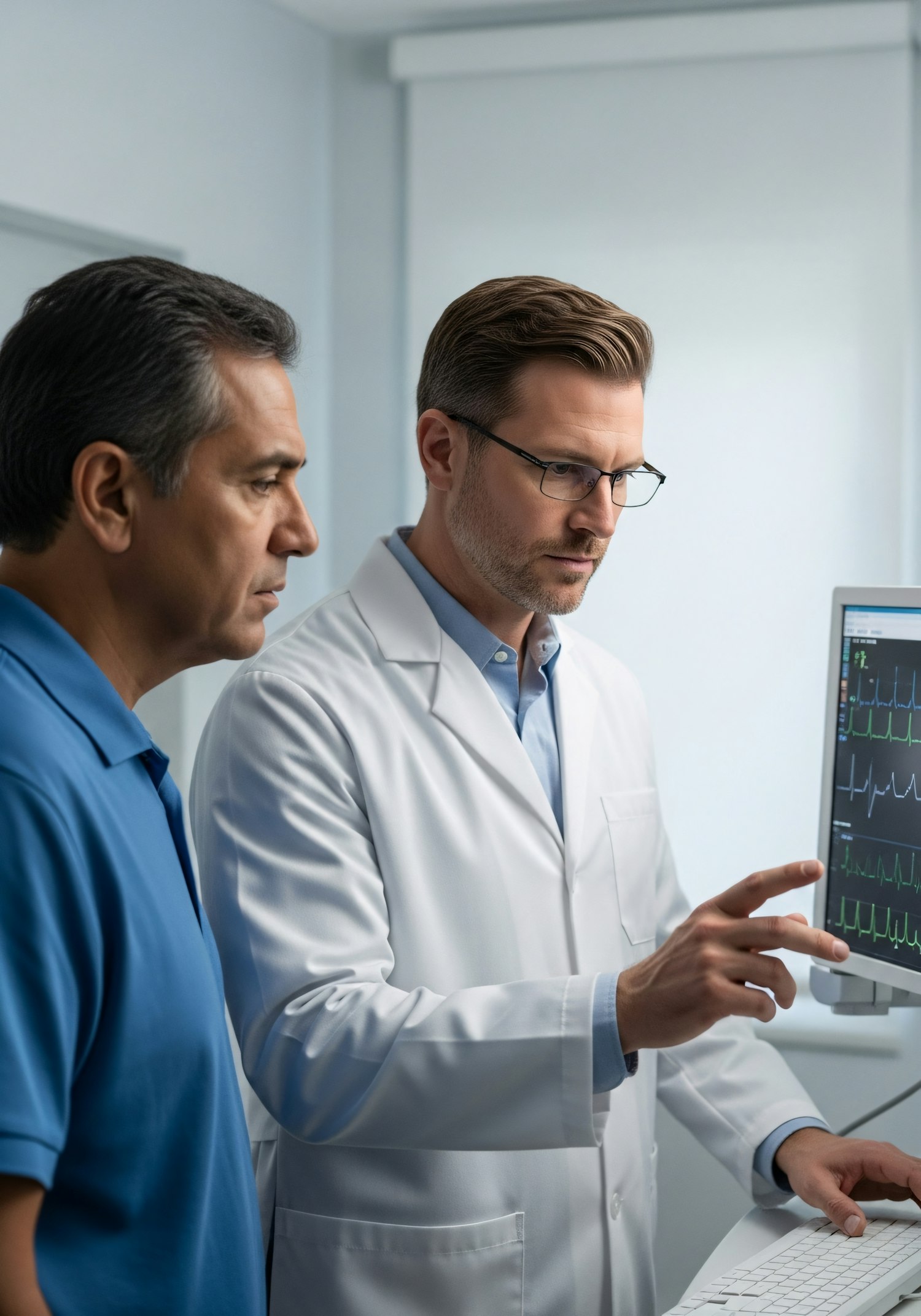 A doctor explains medical data on a monitor to a patient in a clinical setting, highlighting a professional and informative interaction.