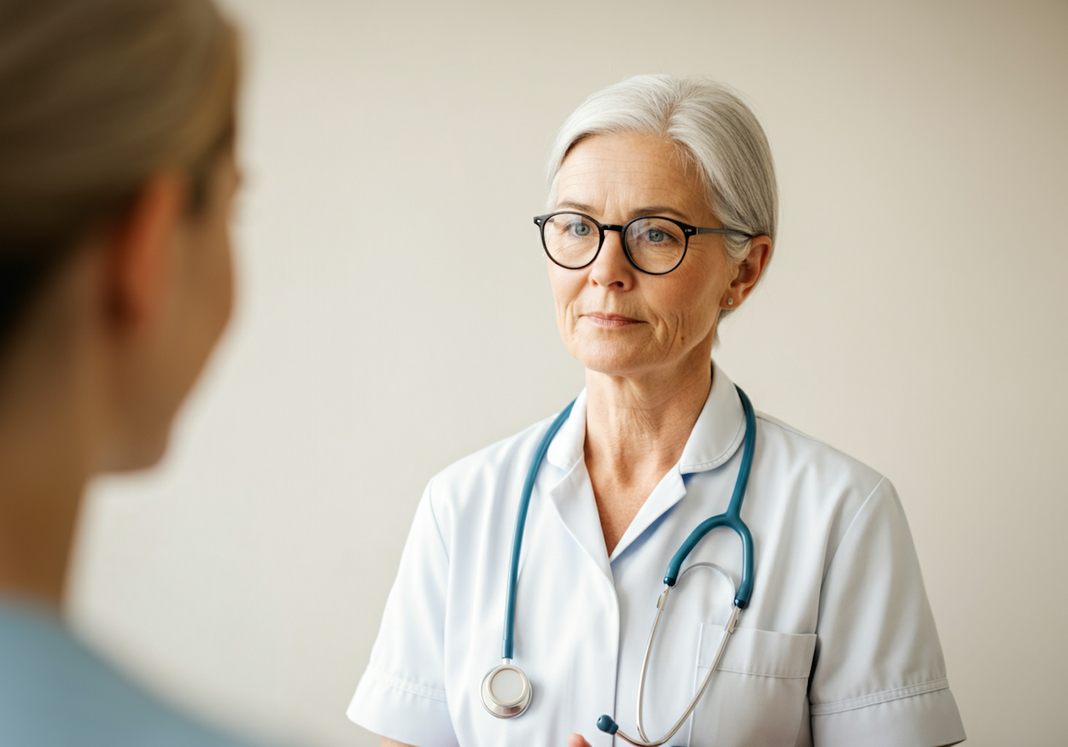 A professional healthcare worker with glasses and a stethoscope listens attentively during a consultation in a neutral setting.