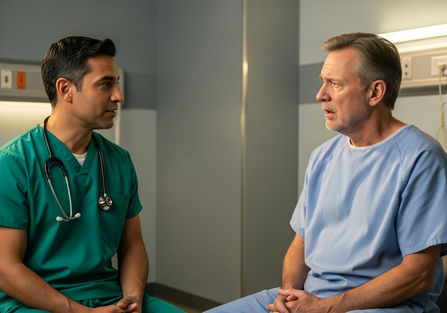 A doctor in green scrubs talks with a patient in a hospital gown, creating a professional and empathetic medical setting.