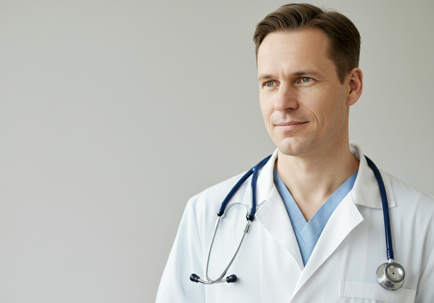 A professional healthcare worker in a white coat with a stethoscope, looking calm and focused against a neutral background.