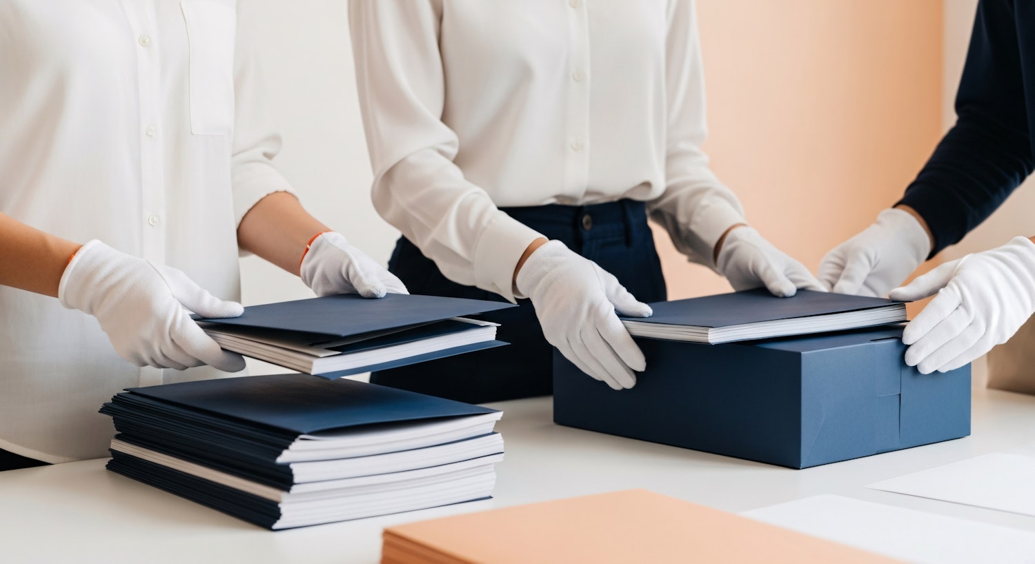 Professionals carefully organizing documents into blue folders and boxes, wearing white gloves for delicate handling.