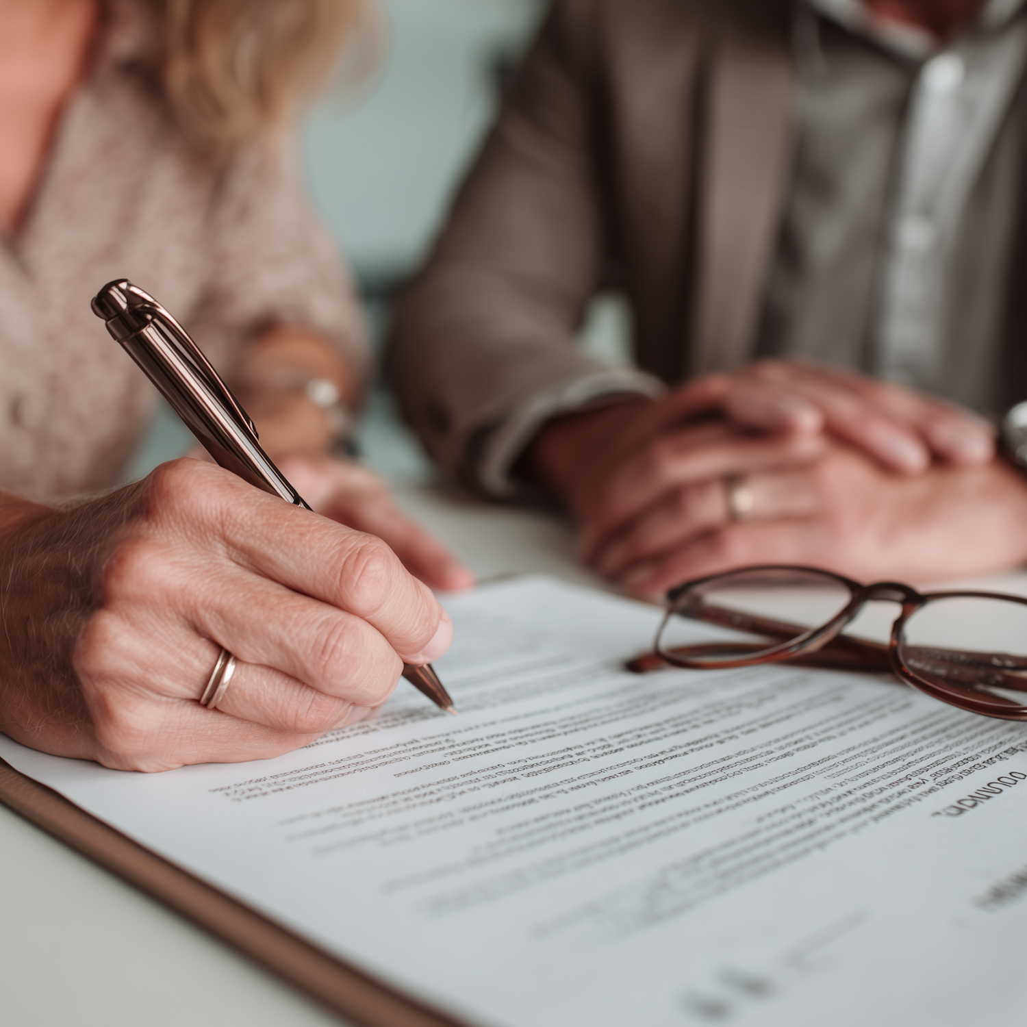 Close-up of a person signing a document with a pen, with glasses and another individual nearby, creating a professional atmosphere.