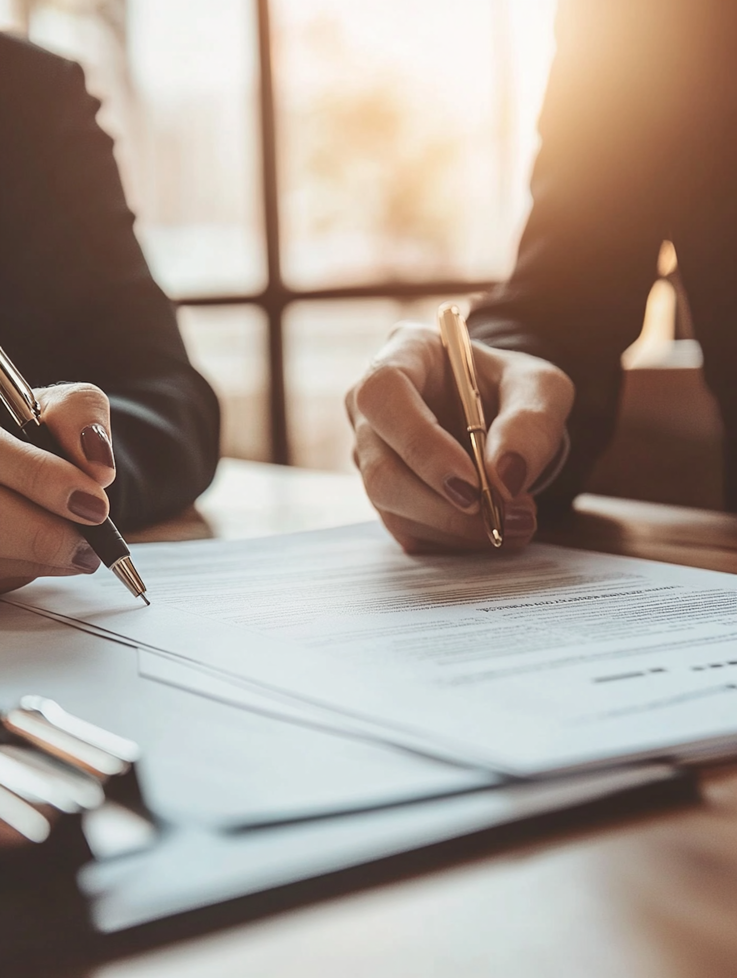 Close-up of two individuals signing formal documents on a wooden desk, with warm sunlight streaming through a window.