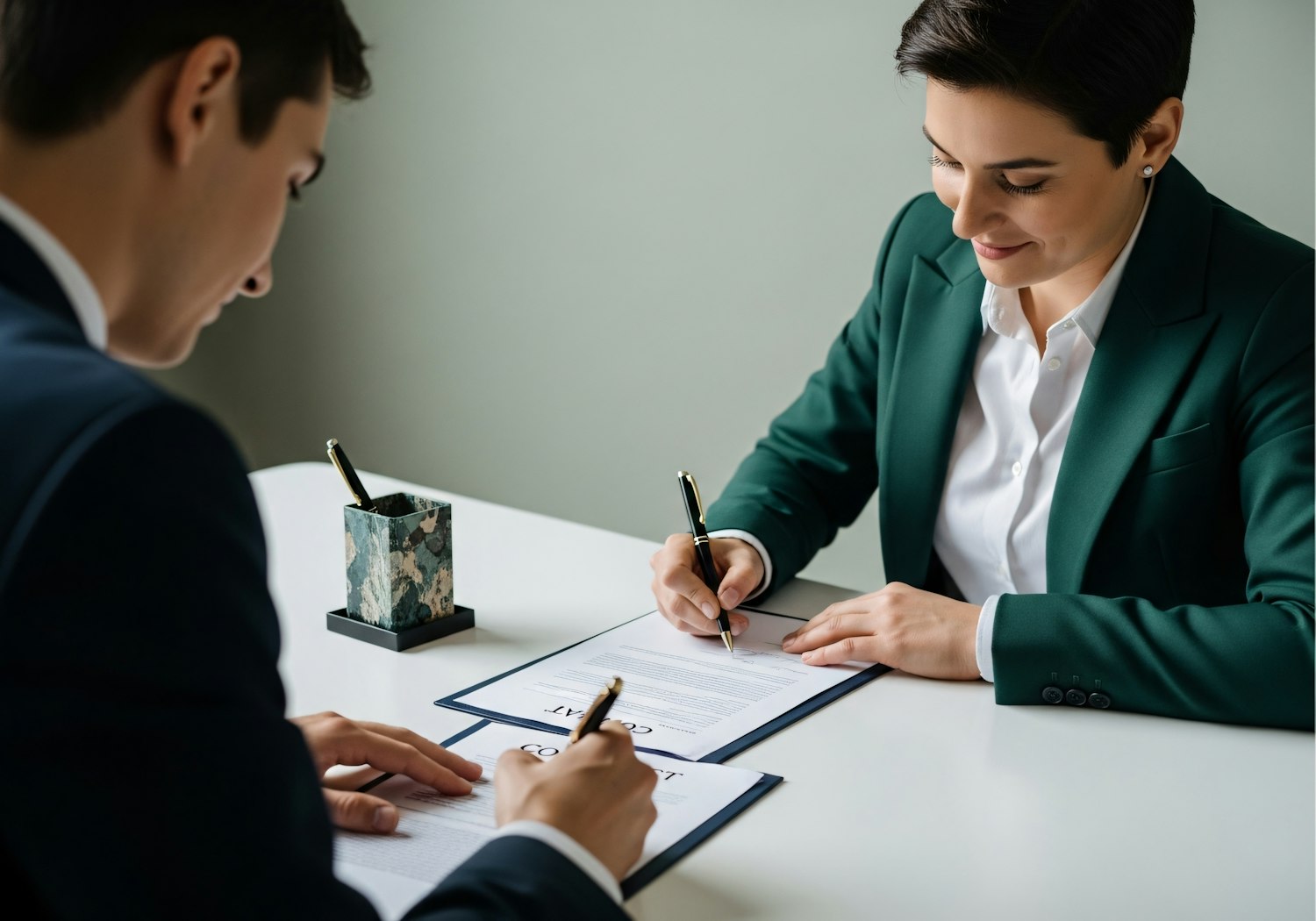 Two professionals signing documents at a desk, showcasing a formal and focused business setting.