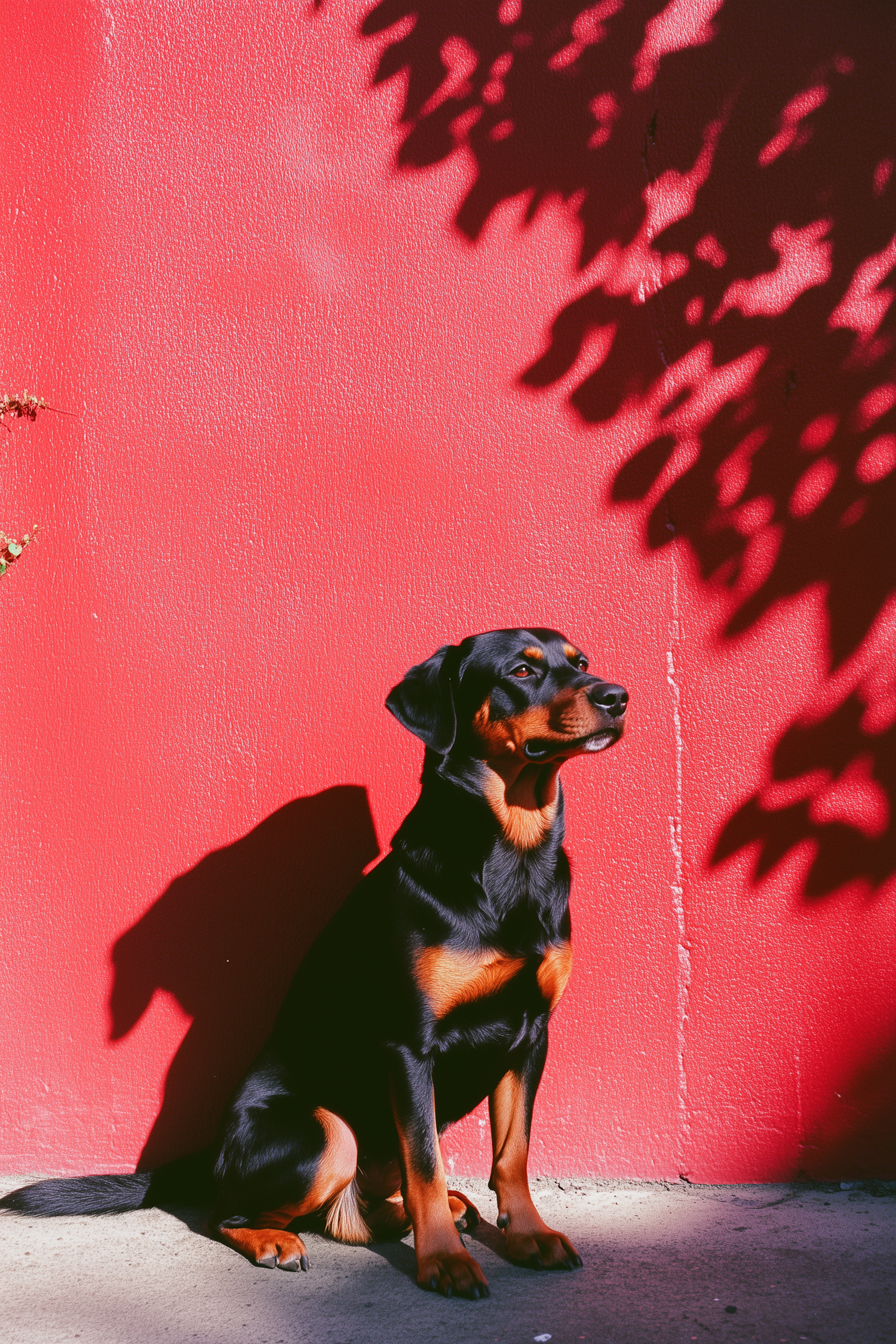 A black and tan dog sits against a vibrant red wall, casting a shadow. Sunlight highlights its glossy coat and the artistic leaf shadows.