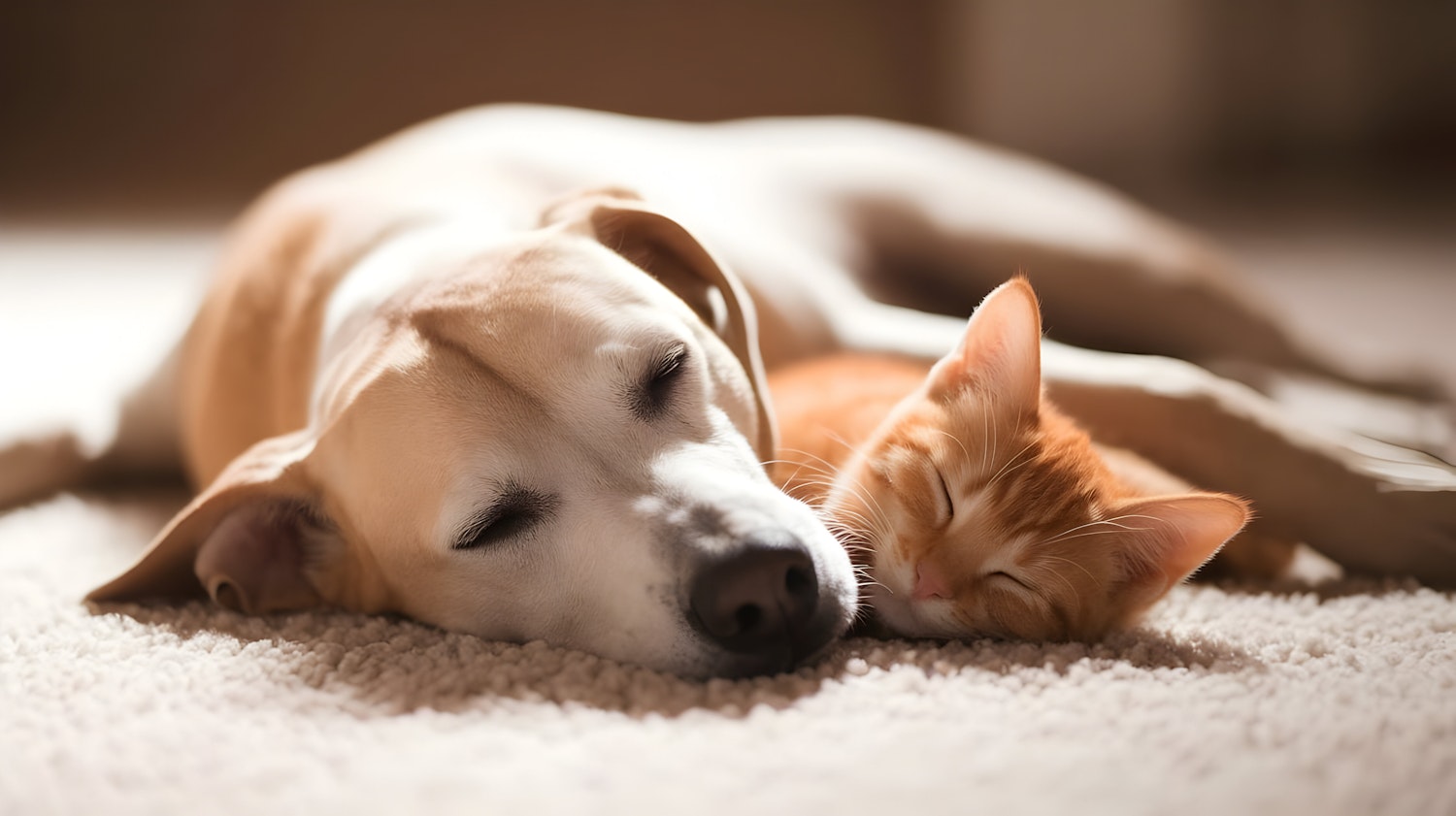 A tan dog and orange kitten peacefully nap together on a soft carpet, bathed in warm light, showcasing their adorable bond.