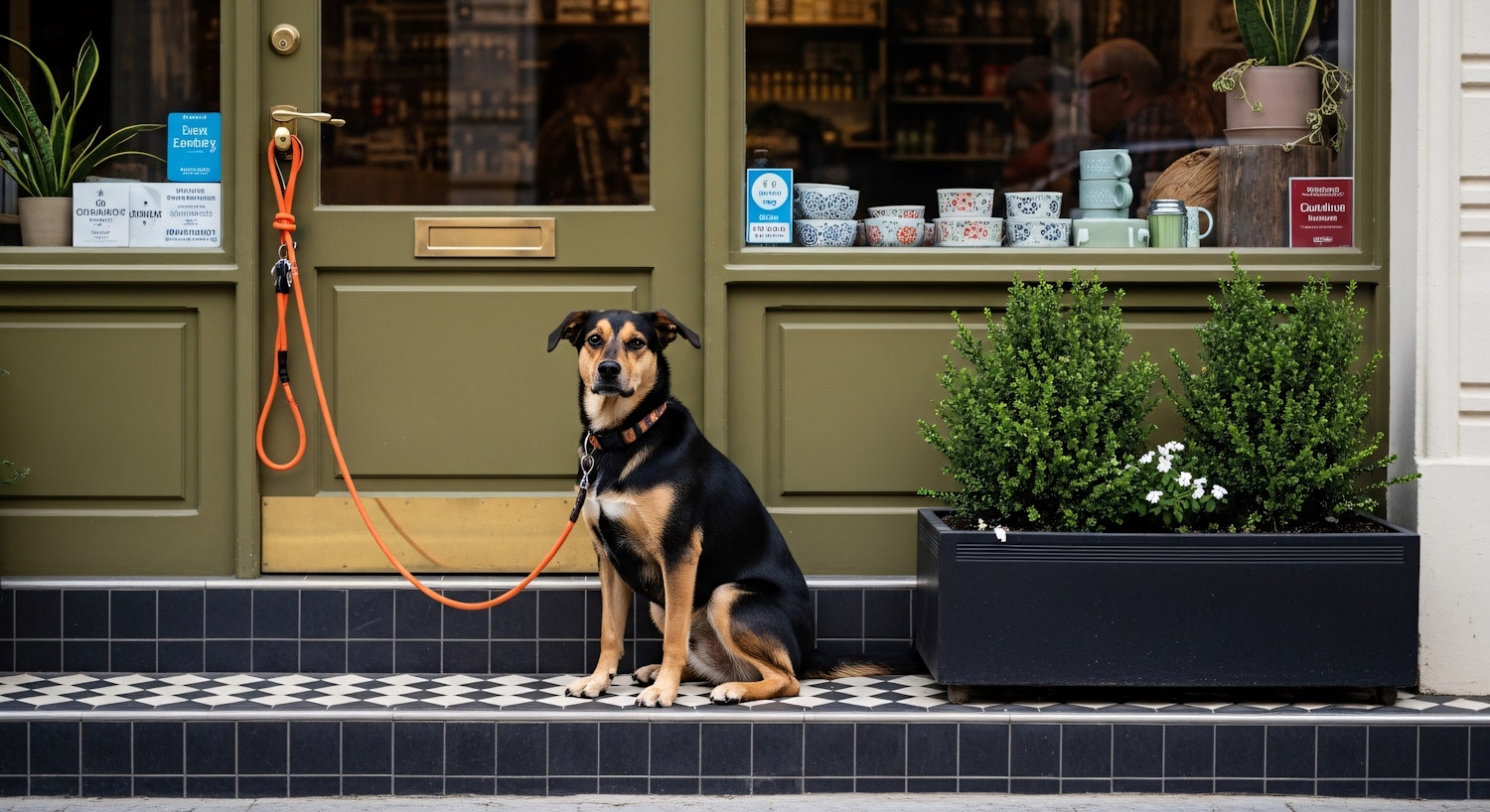 A black and tan dog sits calmly on a tiled doorstep, leashed to a green storefront door with potted plants and ceramic items in the window.