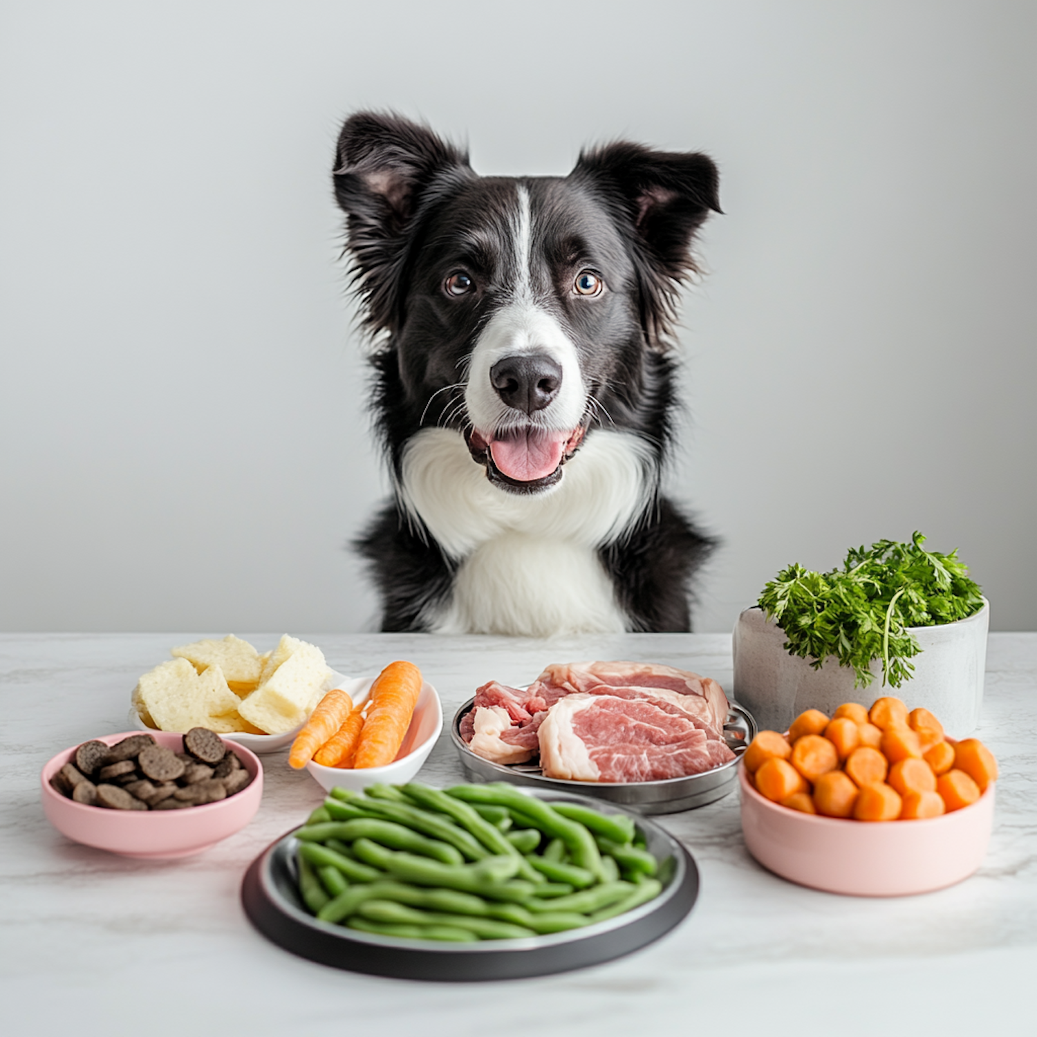 Border Collie with various foods including meat, vegetables, and treats on a table, looking eager and attentive.