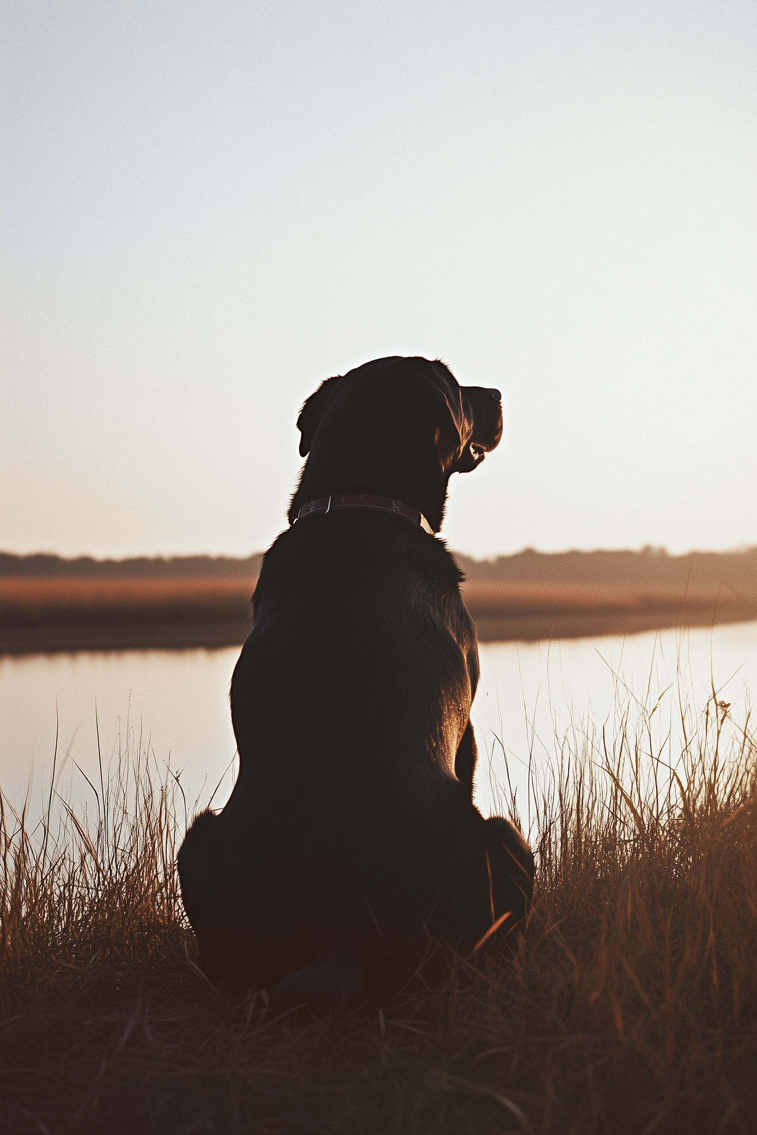 A black dog sits by a lake at sunset, creating a serene and contemplative scene with warm, glowing light and tranquil water reflections.