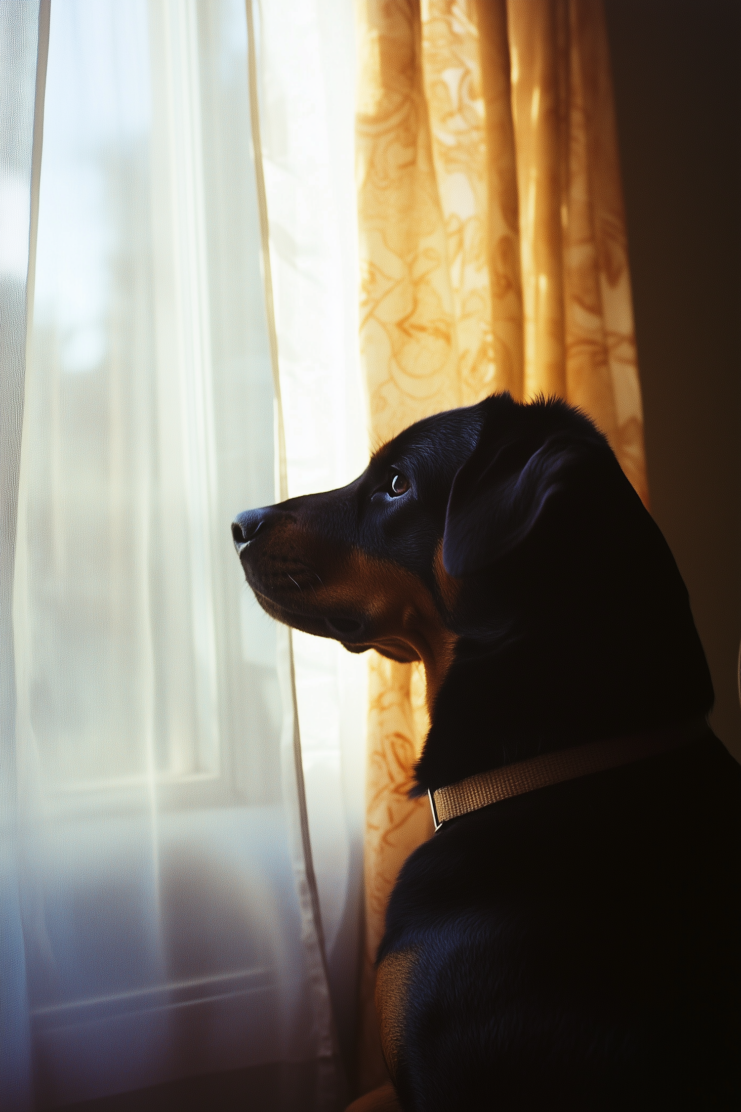 A black and tan dog gazes out a window, illuminated by soft natural light, with golden floral curtains in the background.