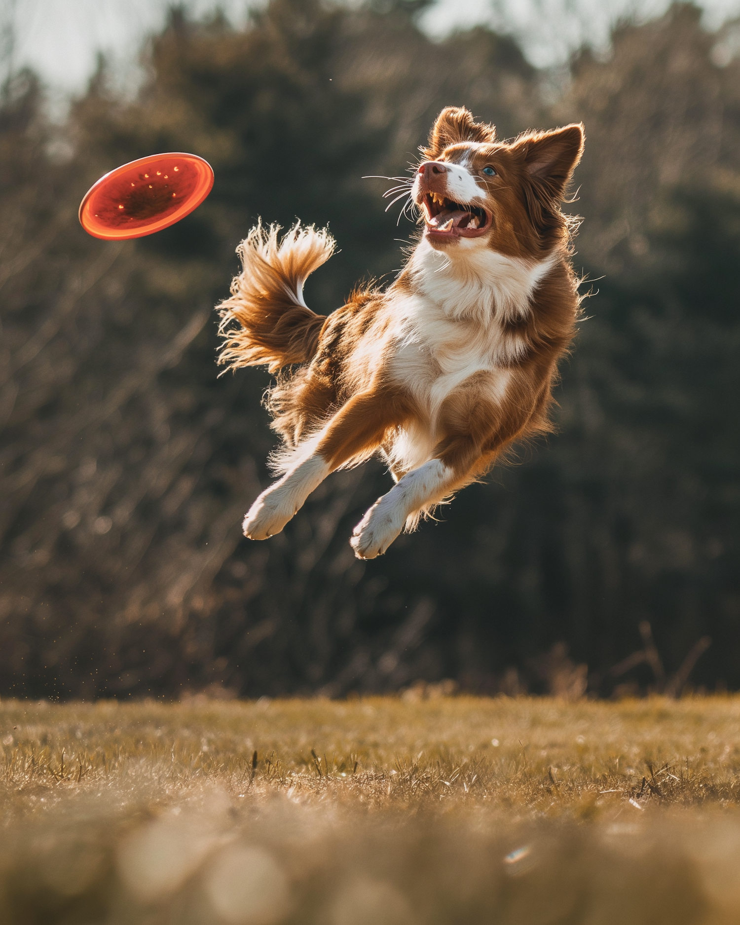 Energetic dog leaps mid-air to catch a red frisbee, set against a sunlit grassy field and blurred tree background.