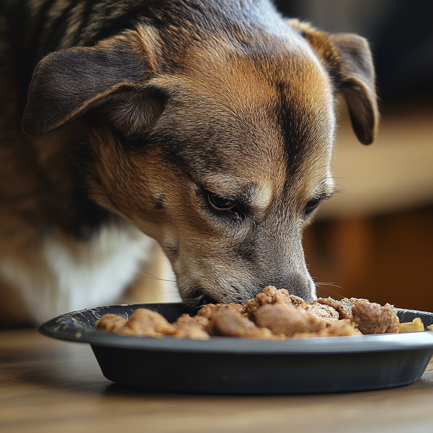 Close-up of a dog eating from a black bowl filled with dog food, showcasing its focused expression and textured fur.