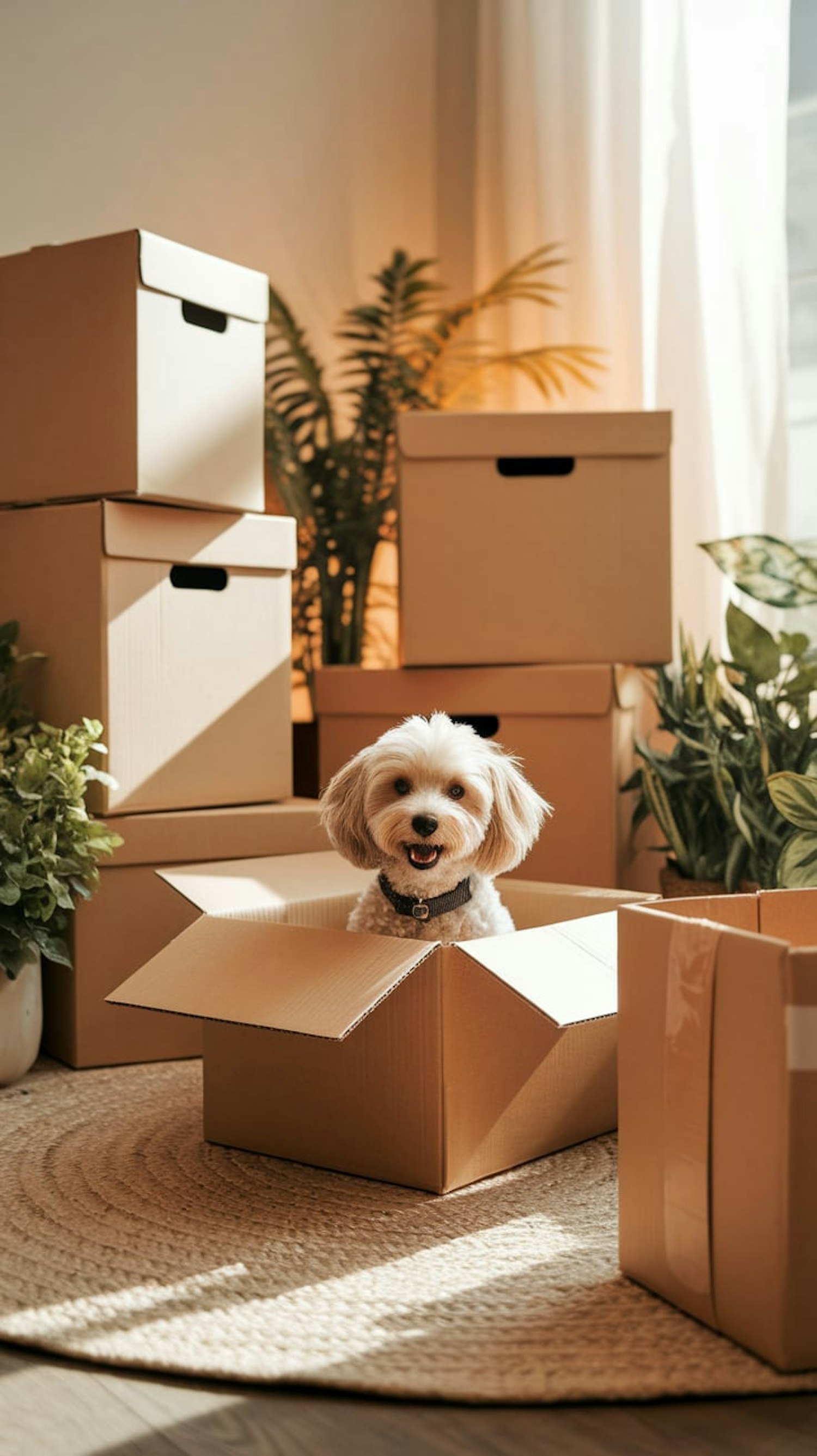 Adorable fluffy dog sitting in a cardboard box surrounded by plants and moving boxes, bathed in warm natural light.
