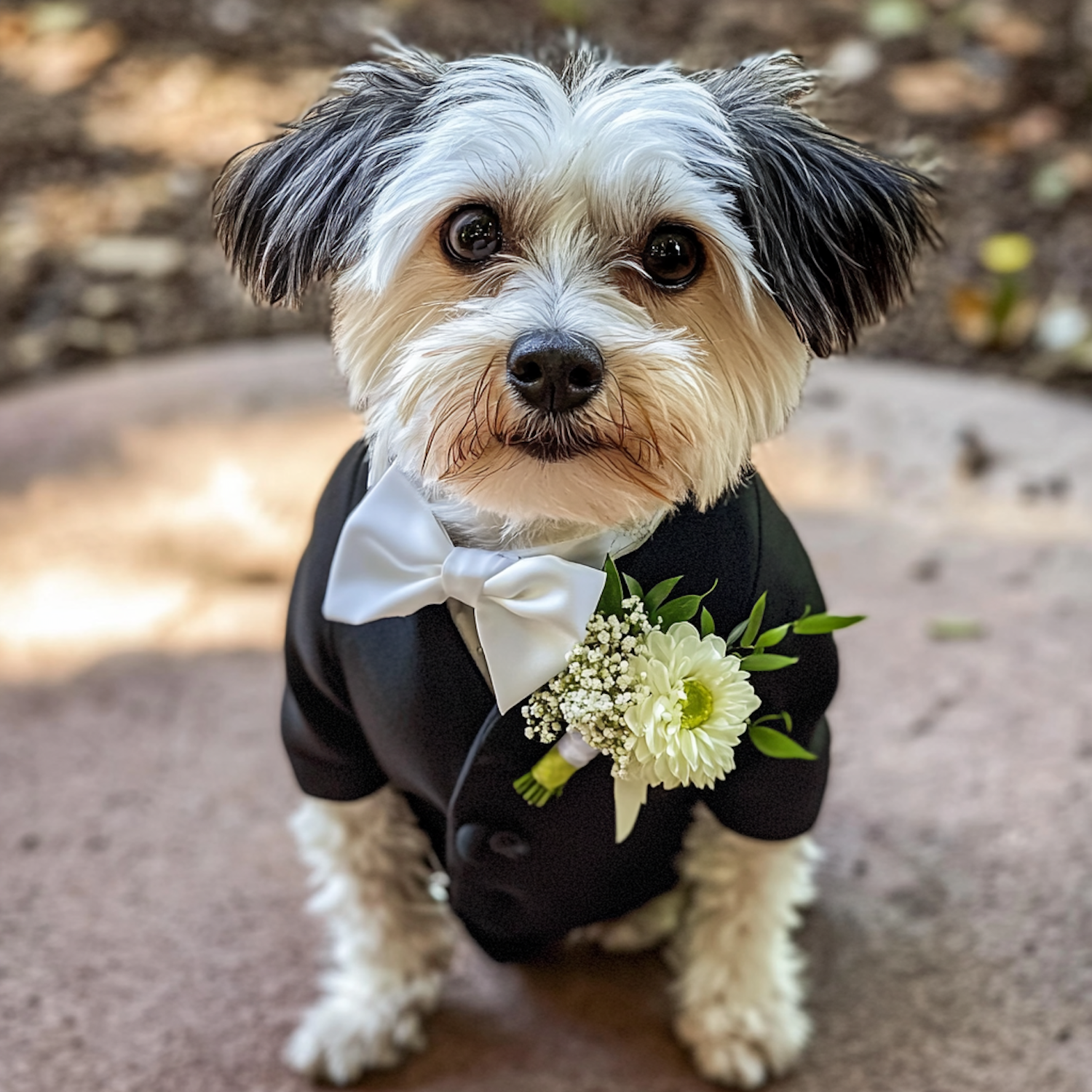 Adorable dog in a tuxedo with a white bow tie and boutonniere, posing for a formal occasion. Perfect for pet lovers and wedding themes.