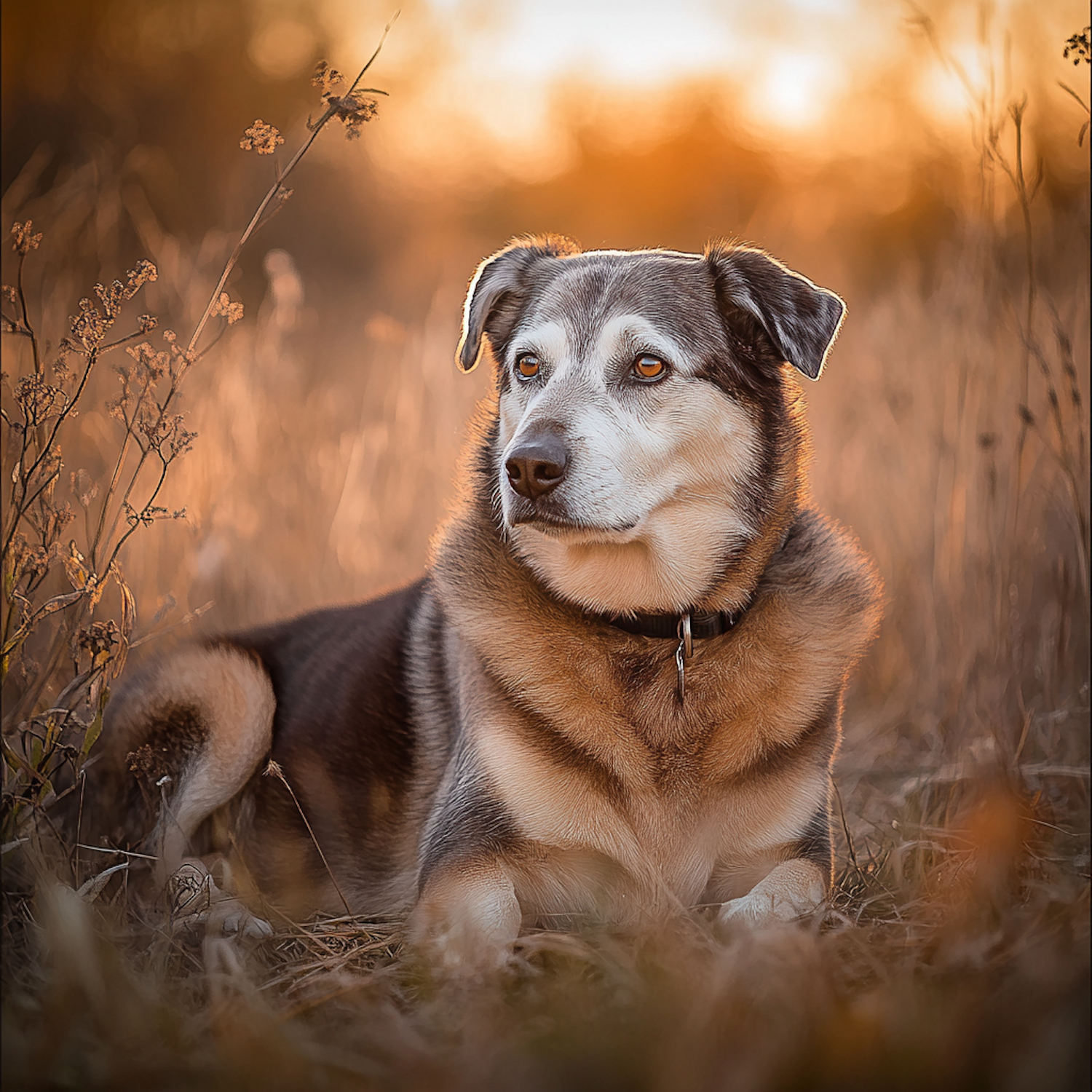A serene dog resting in a golden field at sunset, with warm tones and a calm, attentive gaze. Perfect for nature and pet lovers.
