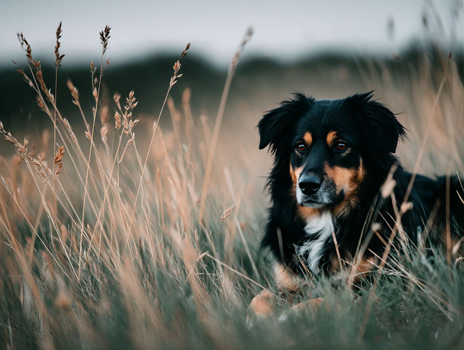 A black and tan dog with a white chest rests in a golden grassy field, gazing forward with a calm and attentive expression.