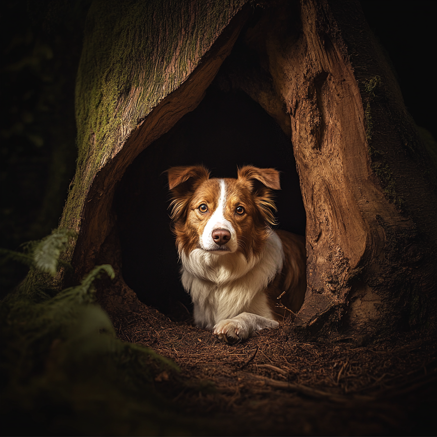 A dog with white and brown fur rests inside a hollow tree trunk, surrounded by dimly lit foliage, creating a serene woodland scene.