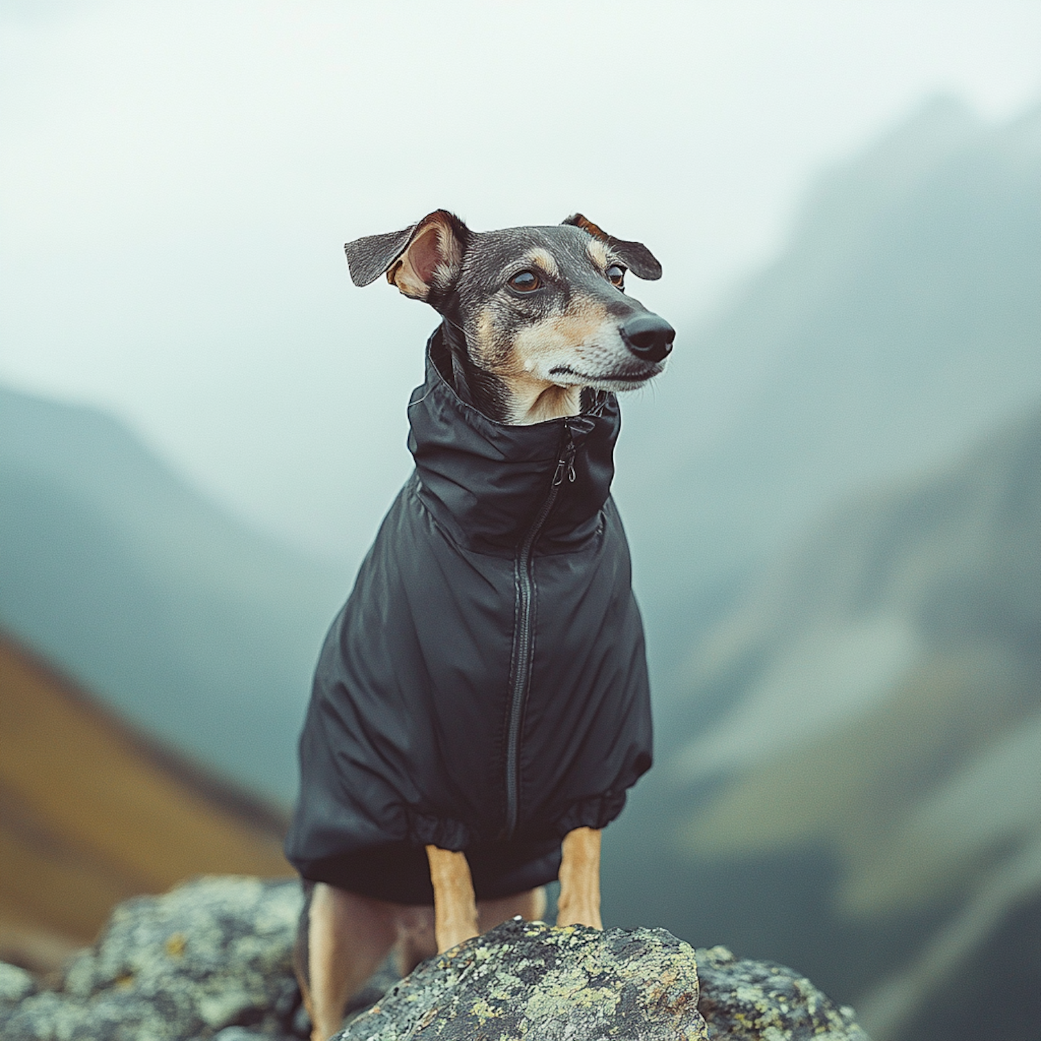 Small dog in a black jacket stands on rocks against a misty mountain backdrop, exuding adventure and readiness.