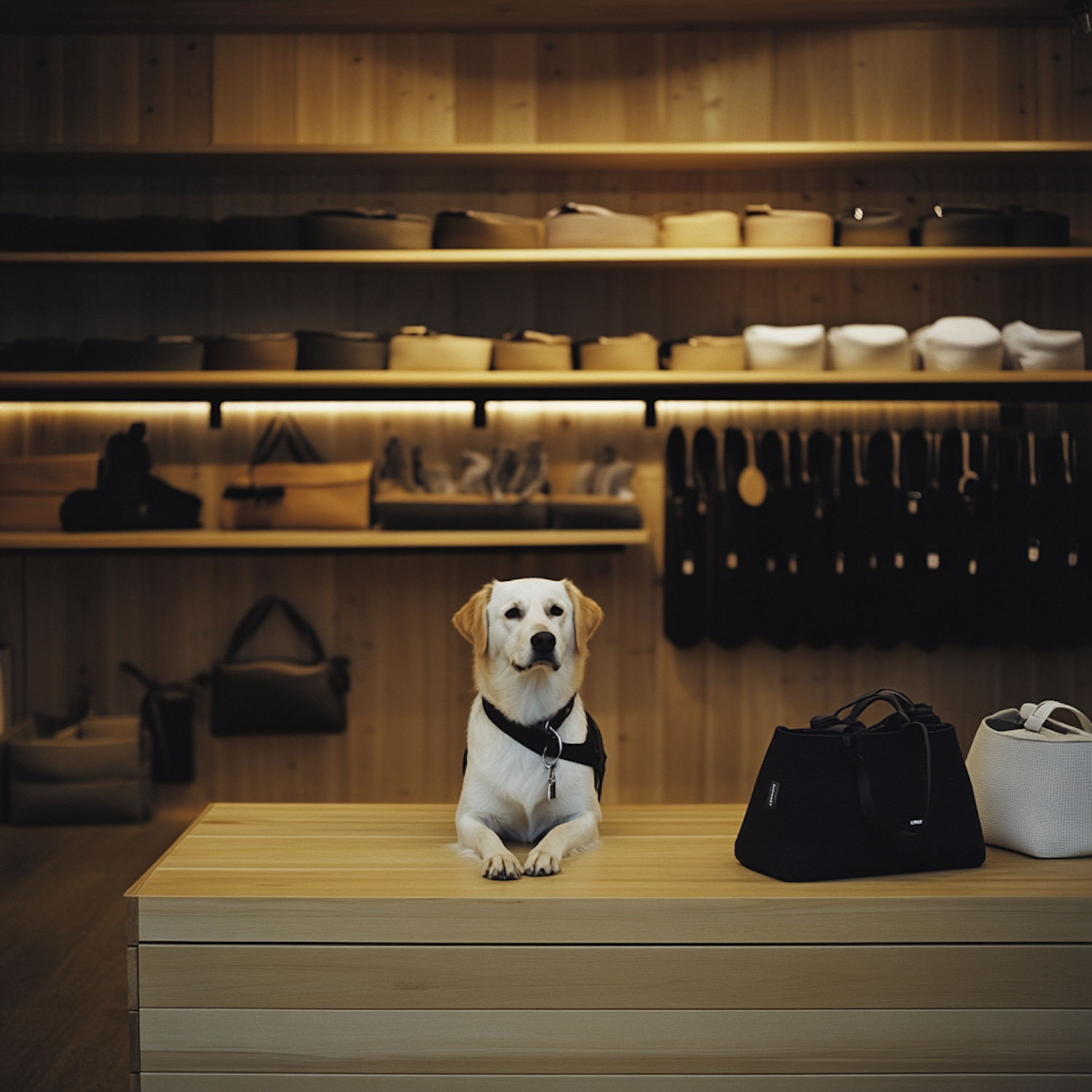 Golden retriever on a boutique counter with stylish bags and accessories in a warm, elegant setting.