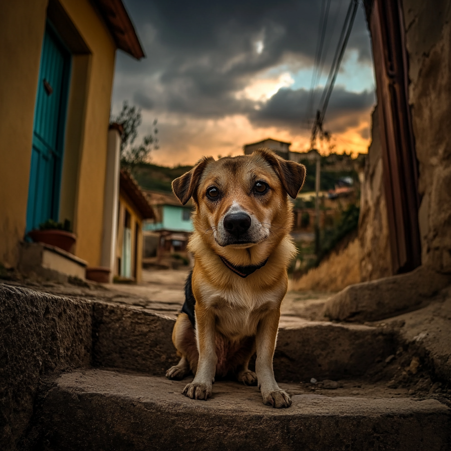 Curious dog sitting on a stone step in a rustic village at sunset, with colorful houses and dramatic clouds in the background.