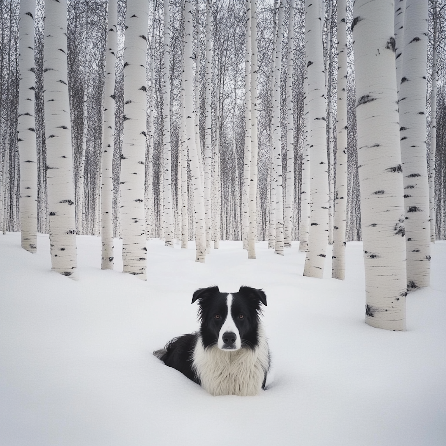 Black and white dog in a snowy birch forest, surrounded by tall trees and pristine snow, creating a serene winter scene.