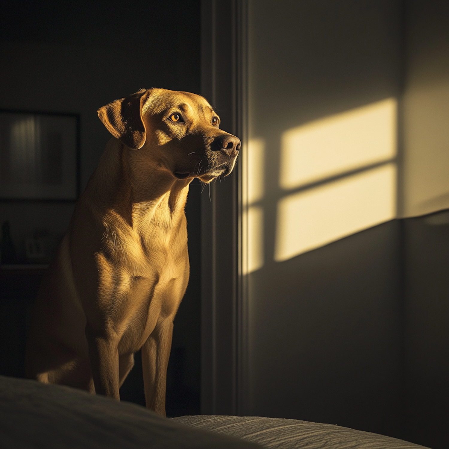 Golden-brown dog in warm sunlight, casting dramatic shadows in a serene room. Minimalist decor adds to the peaceful ambiance.