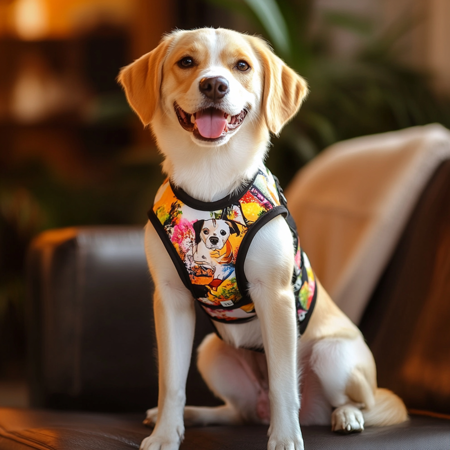 Adorable small dog with a colorful harness sits happily on a leather couch, showcasing a vibrant design and a joyful expression.