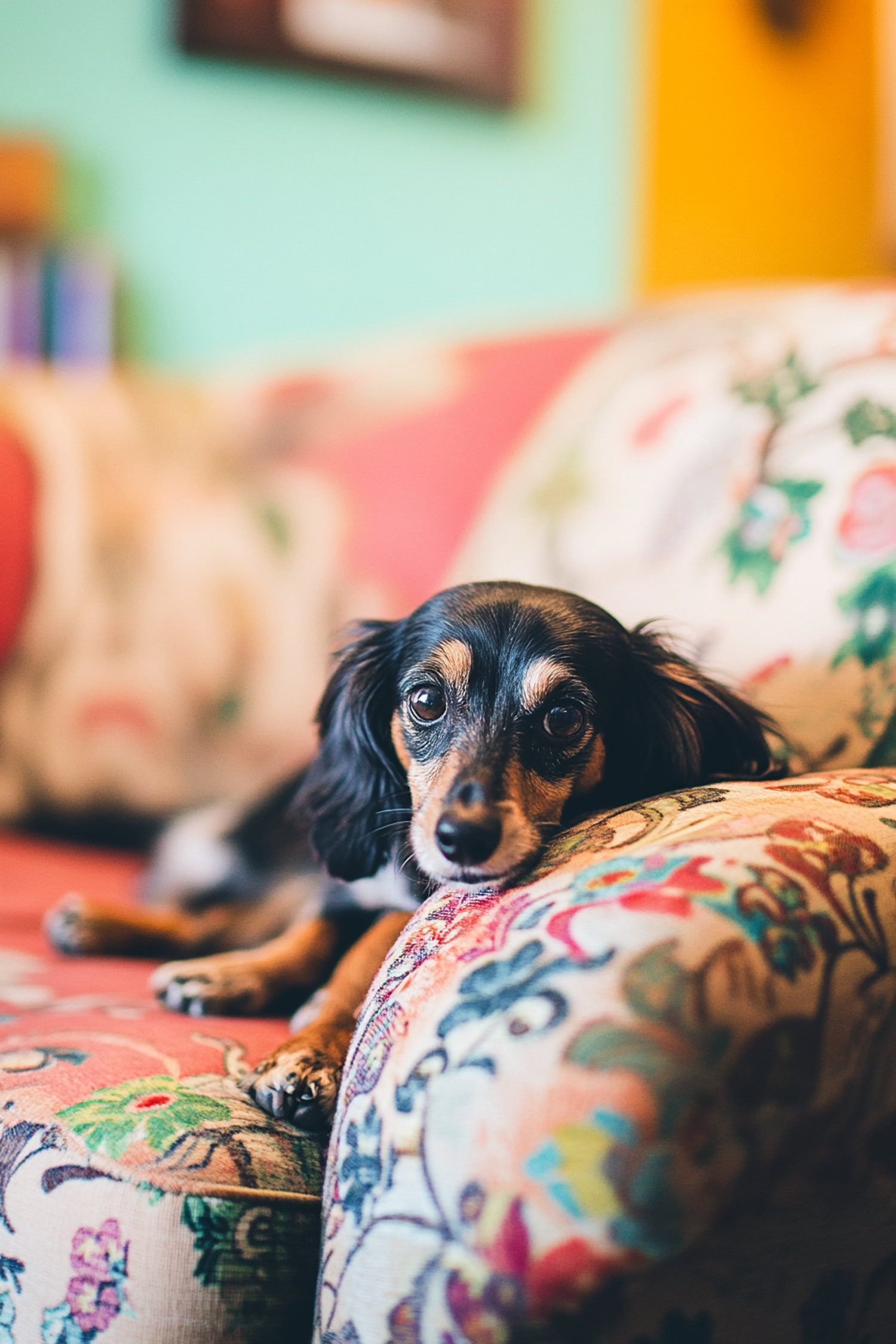 Adorable black and tan dog lounging on a vibrant floral-patterned couch in a cozy, colorful room.
