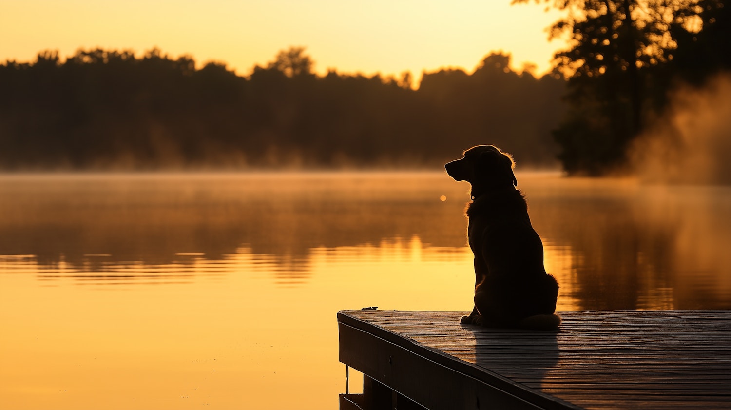 A dog sits on a dock at sunrise, gazing over a misty lake with golden reflections. A peaceful moment in nature's beauty.