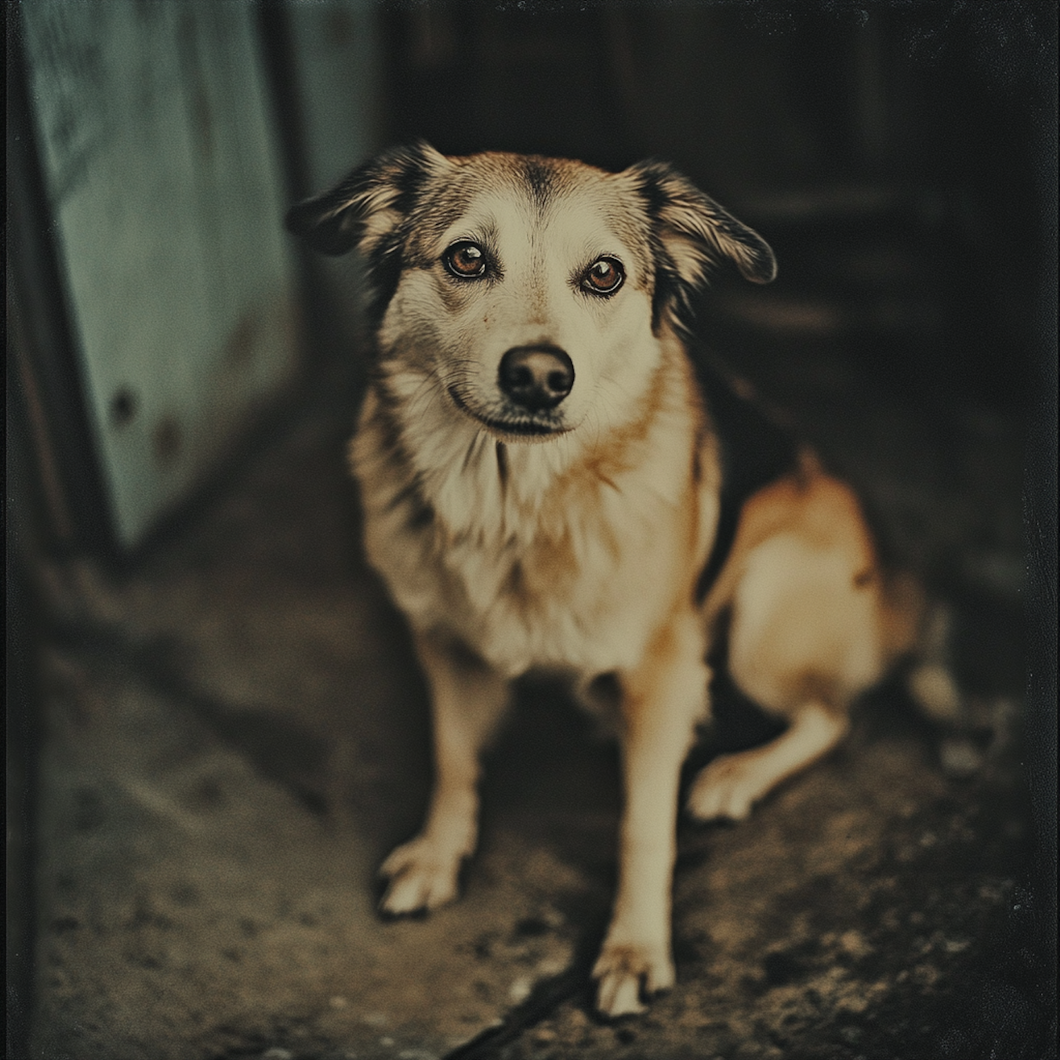 Charming dog with fluffy coat and expressive eyes sits on a rustic floor, exuding warmth and curiosity in a vintage-toned setting.
