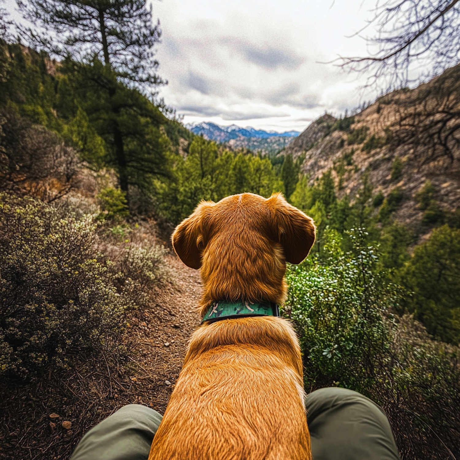 Golden-brown dog on a forest trail, gazing at distant mountains under a cloudy sky. Adventure and tranquility in nature.