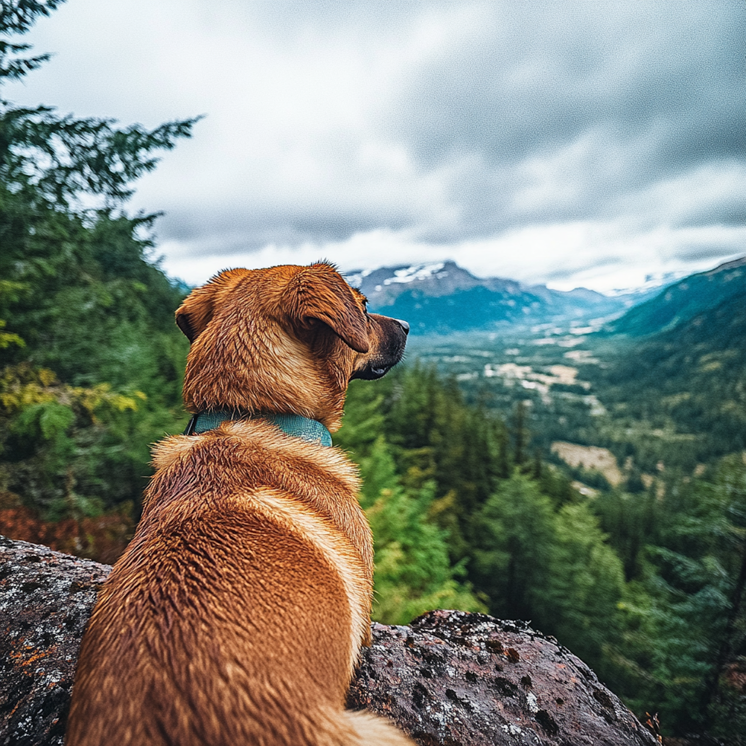 Brown dog with blue collar overlooks lush valley and mountains, sitting on a rocky ledge under a cloudy sky.