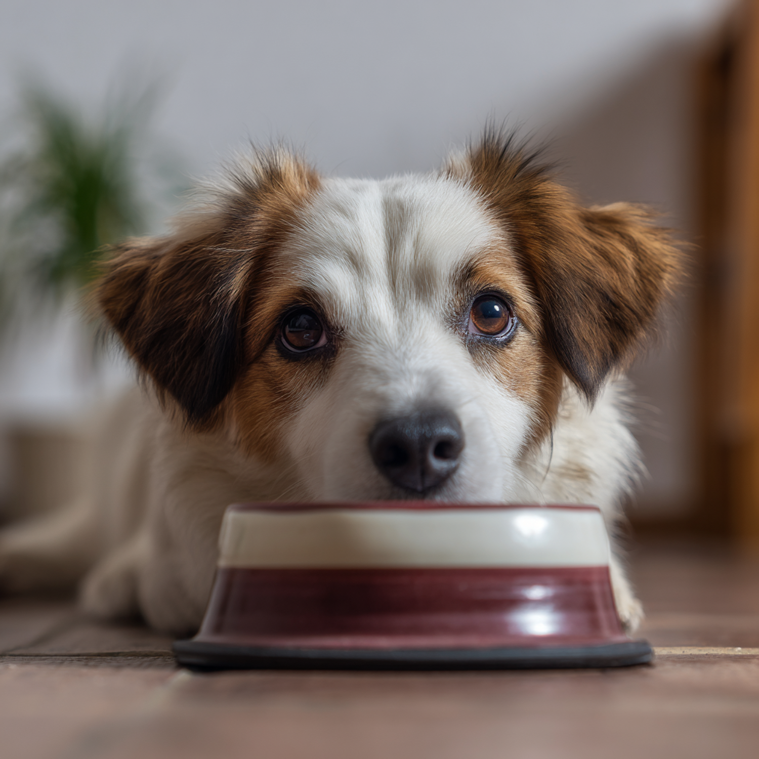 A cute dog with white and brown fur rests its head on a food bowl, looking up with expressive eyes in a cozy indoor setting.