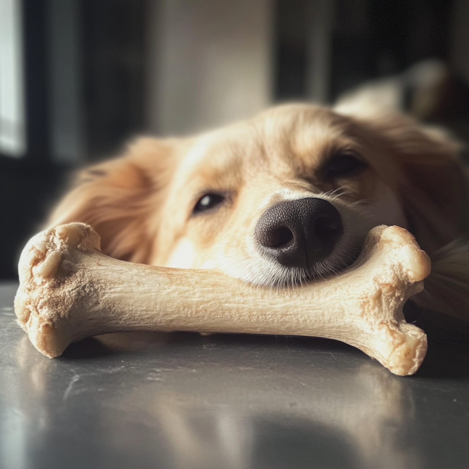 A fluffy dog with light brown fur rests its head on a large bone, exuding a relaxed and content vibe in soft lighting.