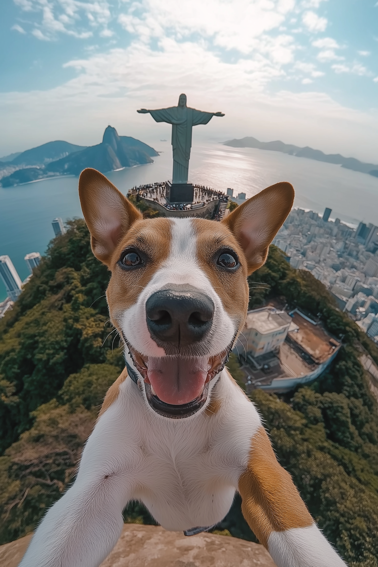 A happy dog takes a selfie with Christ the Redeemer in the background, capturing a playful moment in Rio de Janeiro.