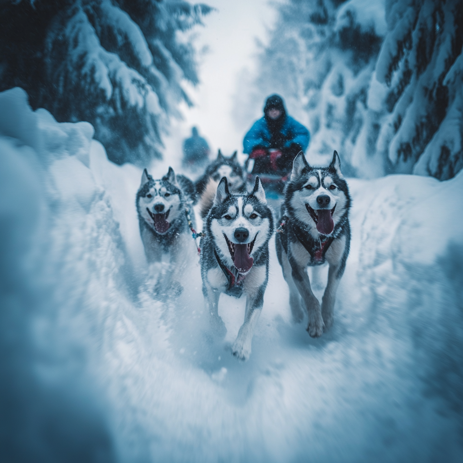 Siberian Huskies pulling a sled through a snowy forest, showcasing their energy and excitement in a winter wonderland.