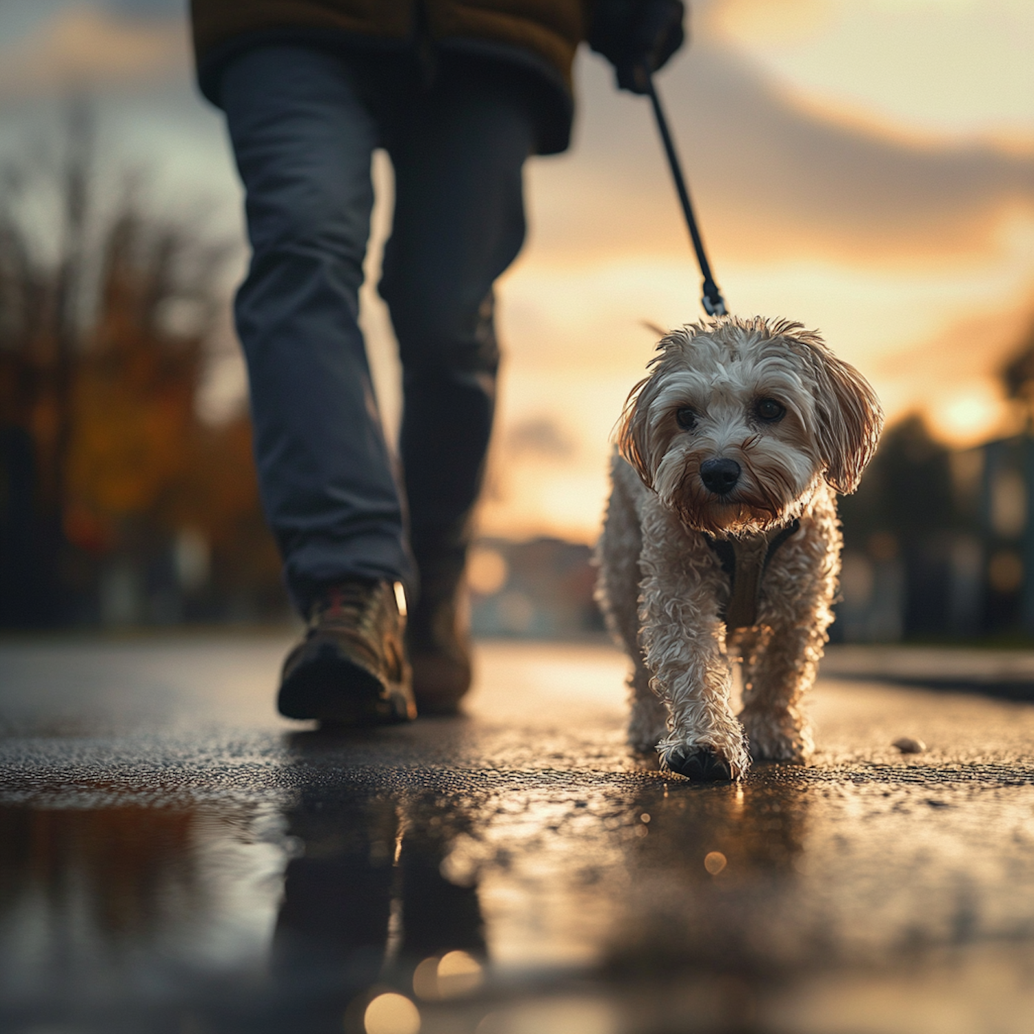 A fluffy white dog on a leash walks on wet pavement during a golden sunset, reflecting light and creating a serene atmosphere.