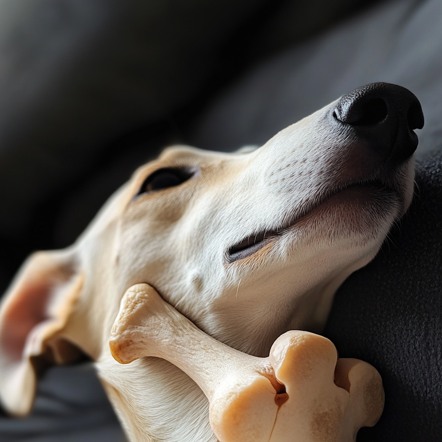 Close-up of a relaxed dog with a bone-shaped chew toy on a dark couch, showcasing its light fur and serene expression.