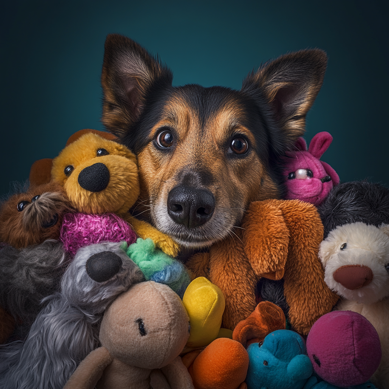 Adorable dog surrounded by colorful plush toys, creating a playful and heartwarming scene with vibrant colors and a curious expression.